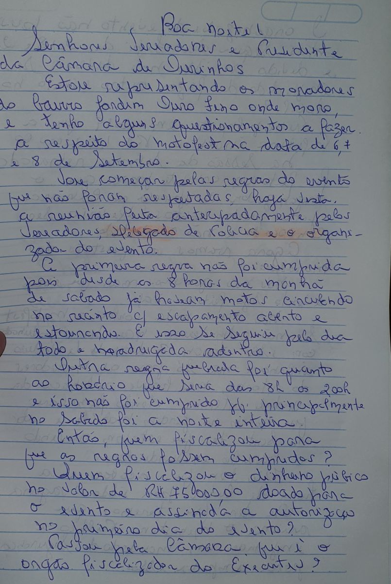A realização do evento Motofest, que aconteceu de 6 a 8 de agosto, foi debatida na Câmara Municipal de Ourinhos, nesta segunda-feira, 9, e contou com o manifesto feito por uma ativista social e moradora do Jardim Ouro Fino, Maria Célia Paganeli Ribeiro, que levou à sessão, uma carta escrita a mão, onde pediu providências e o fim do evento no Recinto Olavo Ferreira de Sá.