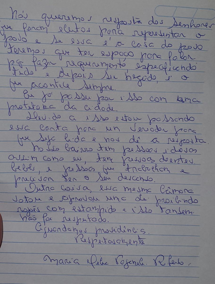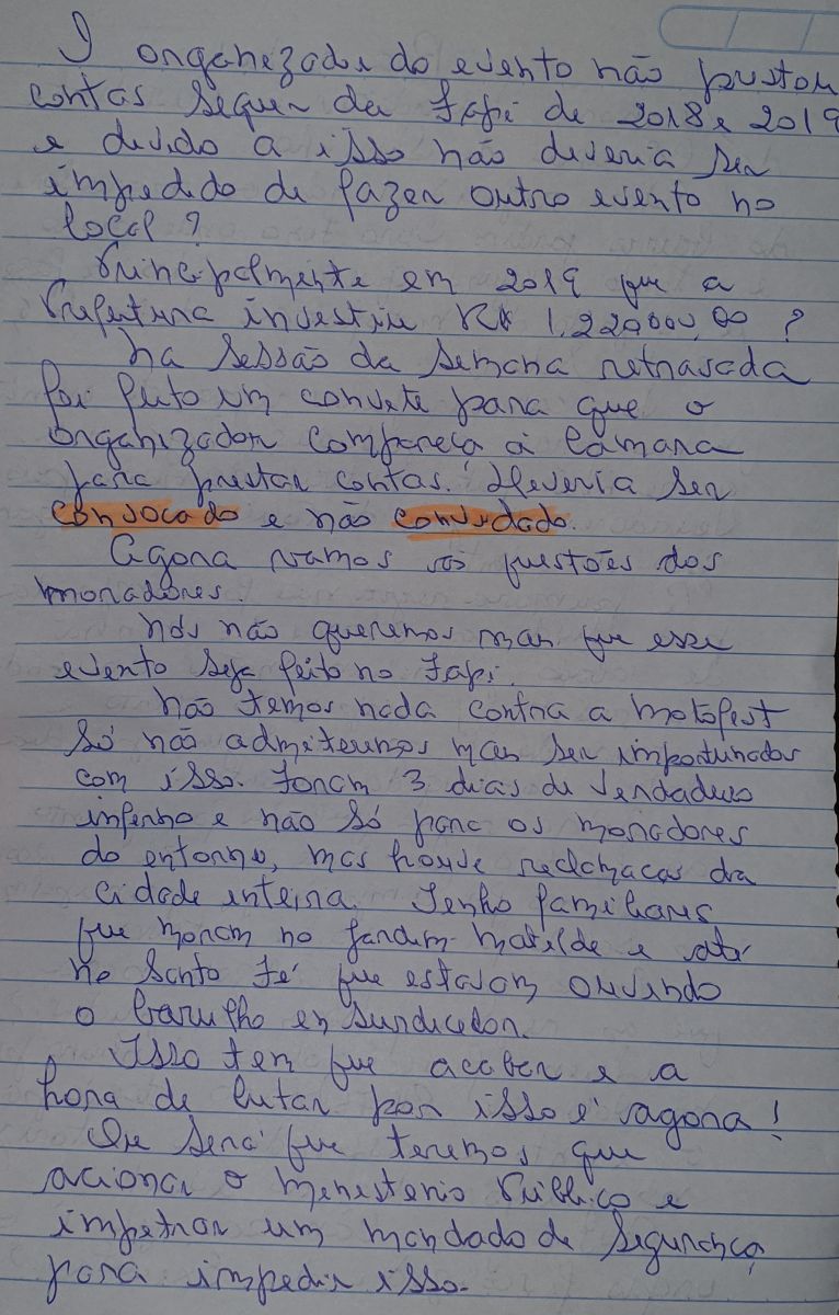 Veja abaixo a carta da mulher escrita a mão, onde ela destaca que a organização do evento não cumpriu as regras impostas durante reunião prévia.