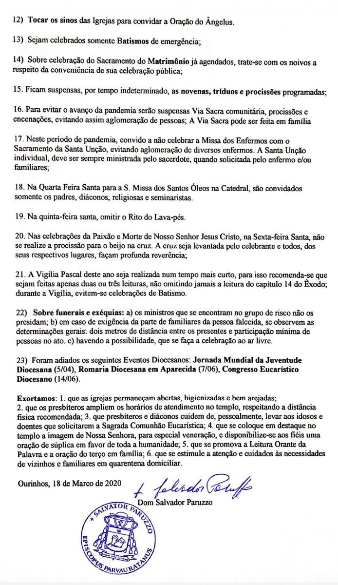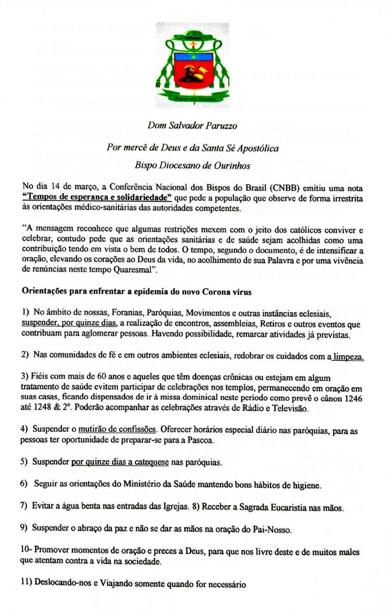 Em um documento de duas páginas, assinado pelo bispo Dom Salvador Paruzzo, consta as orientações de enfrentamento da epidemia do coronavírus (COVID-19) em Ourinhos.