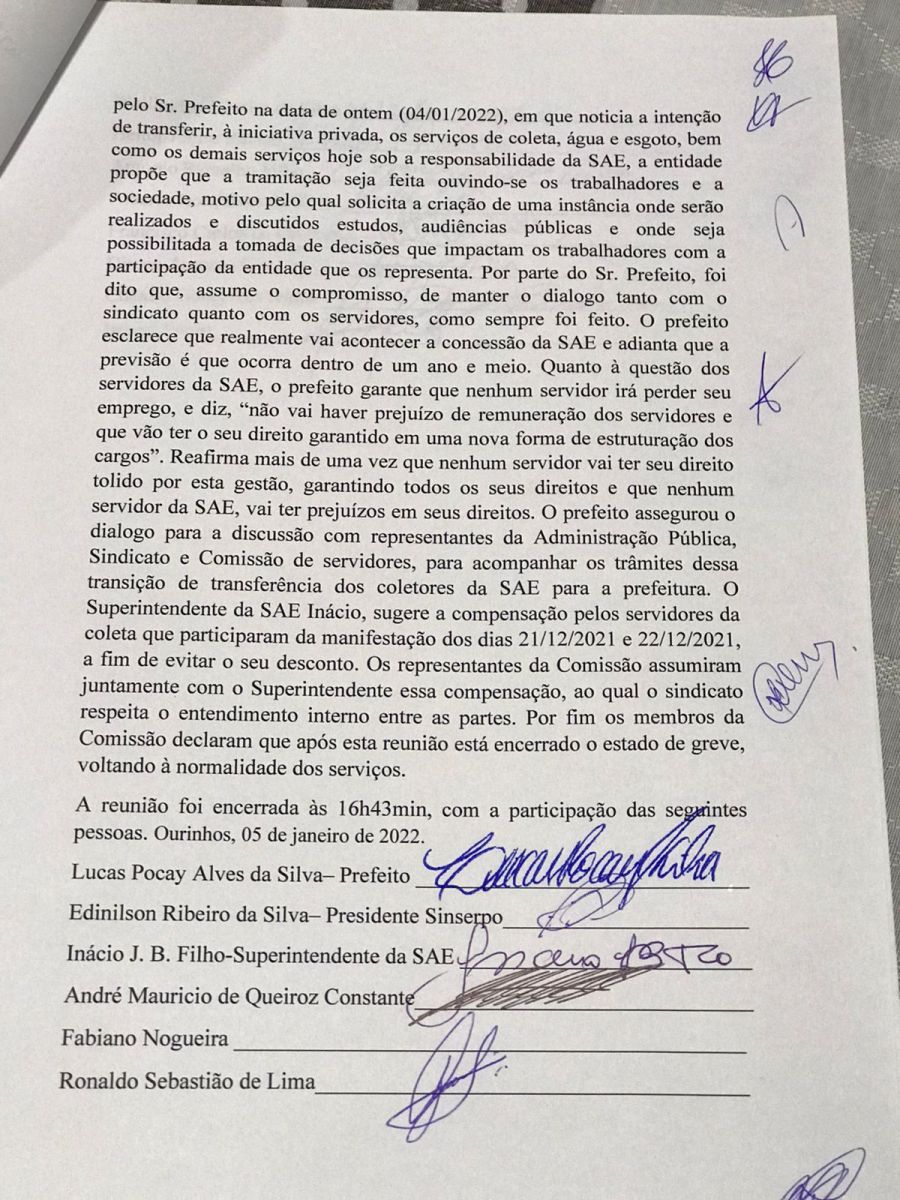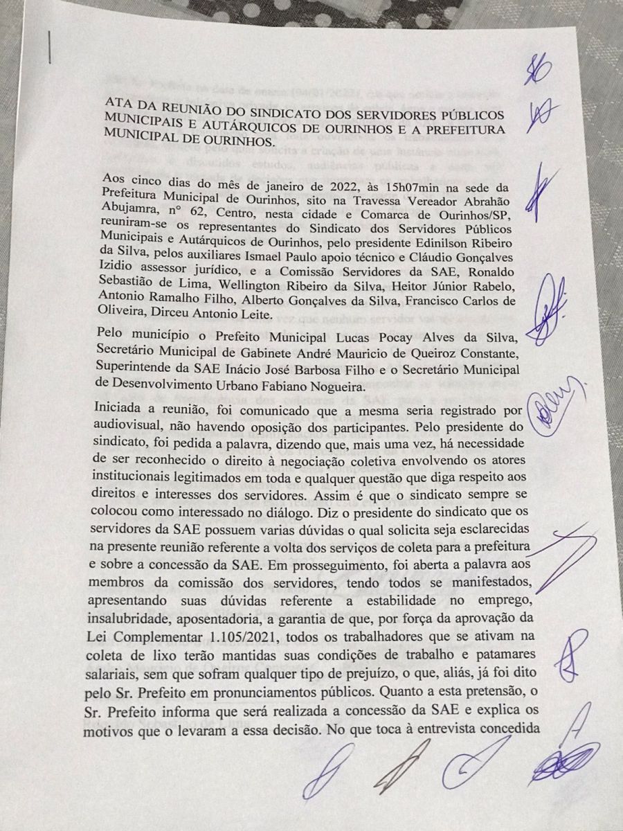 Em ata da reunião, que teria começado às 14h20 e terminado às 16h43, Lucas garante que nenhum servidor da SAE (Superintendência de Água e Esgoto de Ourinhos) sairá prejudicado, nesta transição da autarquia para a Prefeitura de Ourinhos, começando com os coletores e depois com o restante dos funcionários, já que ele reafirmou que a SAE será mesmo concedida. De acordo com Lucas, a concessão de 100% da SAE deverá ser concretizada em no máximo um ano e meio.
