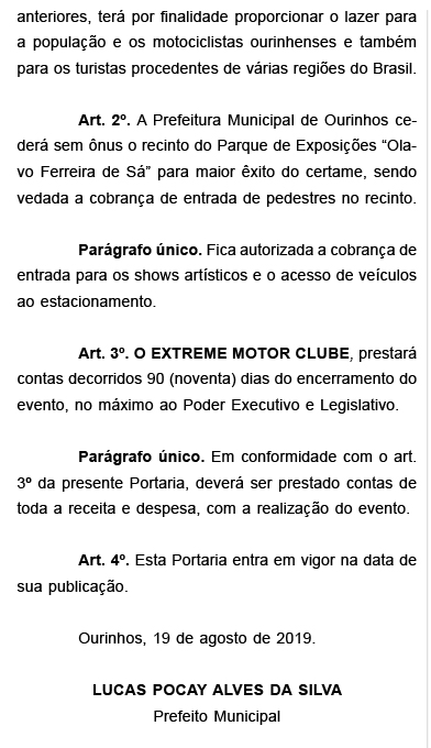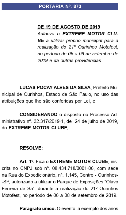 A prefeitura de Ourinhos publicou, nesta sexta-feira, 23, no Diário Oficial do Município, a PORTARIA Nº. 873, que Autoriza a empresa “EXTREME MOTOR CLUBE” a utilizar o próprio municipal (Parque “Olavo Ferreira de Sá”) para a realização do 21º Ourinhos Motofest, no período de 06 a 08 de setembro de 2019.