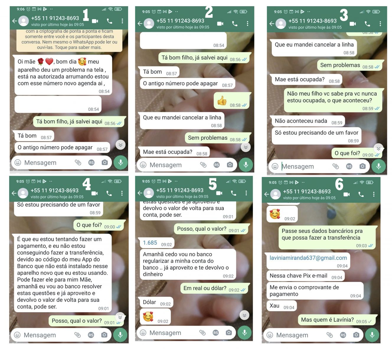 E foi isso que aconteceu em Ourinhos. Se passando pelo filho da vítima, o golpista se deu mal, pois acabou entrando em contato com padrasto e não com a mãe do suposto filho. O padrasto, sabendo do golpe, manteve a conversa, até que o bandido, que estava com o número (11) 9143-8693, pediu a transferência de 1.685, que o padrasto se passando pela mãe, concordou em transferir em dólares, só para o golpista passar os seus dados bancários e ele passou. Trata-se de Lavinia Elen Santana de Miranda, com e-mail: laviniamiranda637@gmail.com