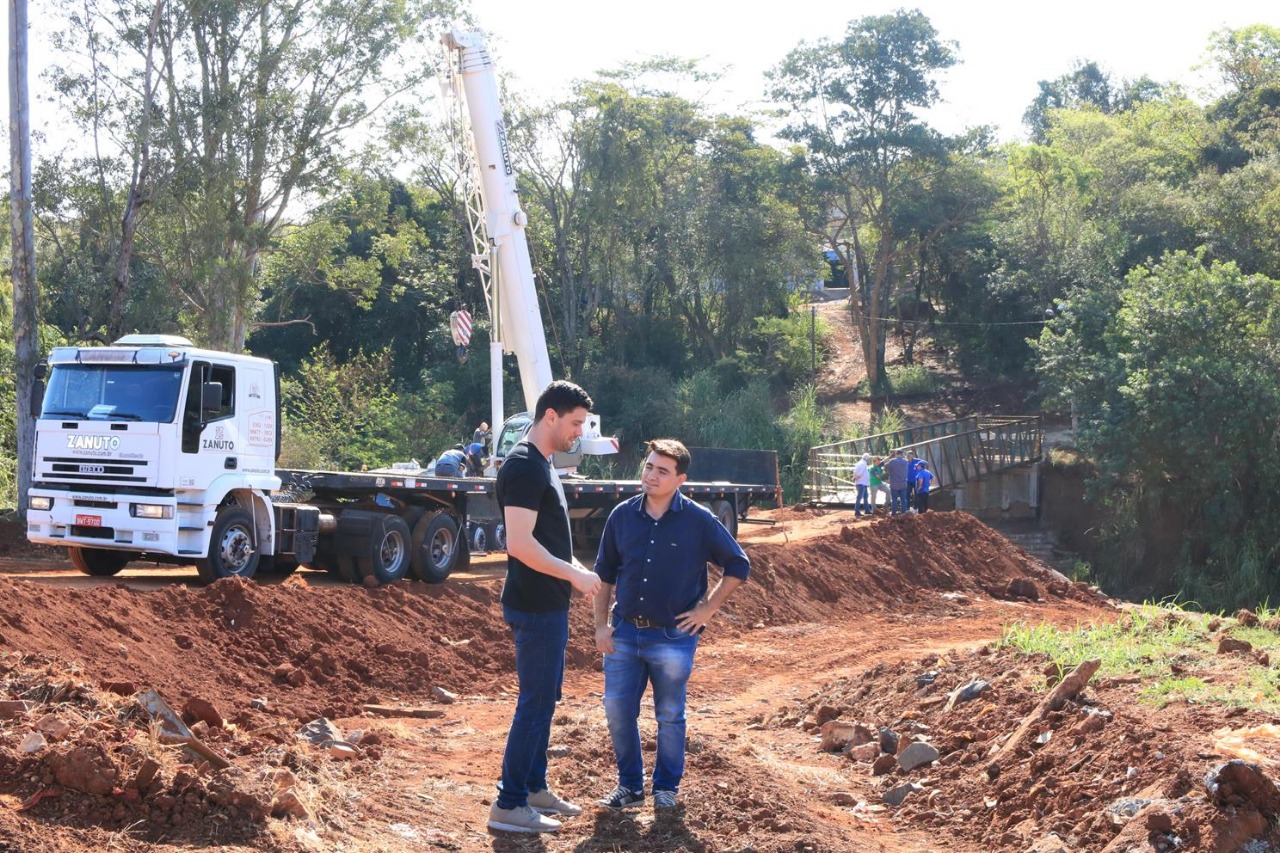 Prefeito Lucas Pocay (PSD) e o vereador Caio Lima (PSC) estiveram presentes durante a colocação da ponte (Foto: Divulgação)