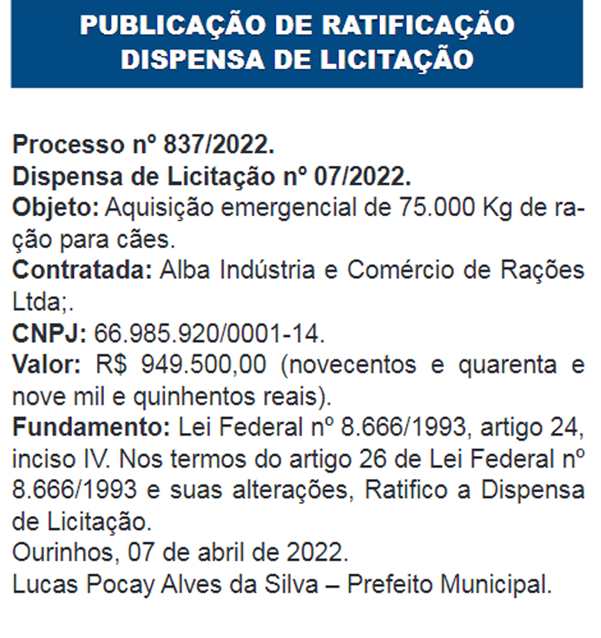 Uma publicação feita na última sexta-feira, 8, no Diário Oficial do Município, chama bastante a atenção, principalmente das entidades que lutam pela causa animal em Ourinhos. A Prefeitura está comprando, sem a devida licitação, de forma emergencial, 75 mil quilos de ração para cães e vai gastar R$ 949.500,00 (novecentos e quarenta e nove mil e quinhentos reais) (R$12,66 o kg). Na publicação não consta a justificativa para a compra emergencial. A empresa contratada é Alba Indústria e Comércio de Rações Ltda de Piracicaba (SP).