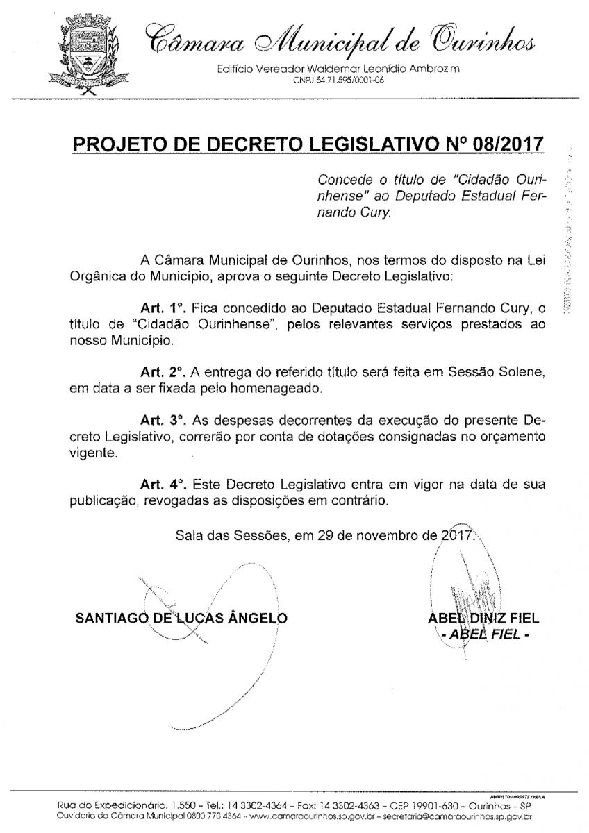 “No ano de 2017 o deputado Fernando Cury foi agraciado com o título de "cidadão ourinhense" pela Câmara Municipal da época. Ali ele ainda não havia ajudado a retirar da pauta de votação da Assembleia Legislativa, o PDL 22 que revogaria o confisco imposto por Dória, aos rendimentos dos Servidores públicos estaduais aposentados. Também não havia sido expulso do seu partido e punido com 6 meses de suspensão "saiu barato" após apalpar a deputada Isa Pena no plenário da Assembleia legislativa”, destacou o professor Adolar José Raimundo, em uma rede social.