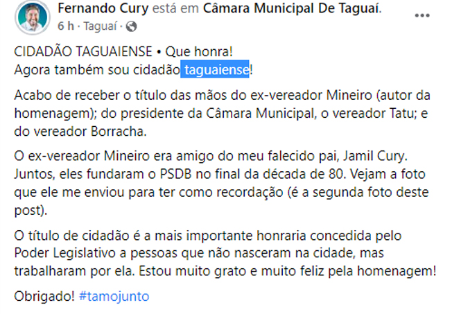 Fernando Cury, que está respondendo por processo de importunação sexual, participou de uma entrevista, no começo da tarde, em uma emissora de rádio (evangélica) e fez visitas em locais públicos, acompanhado do secretário adjunto de Meio Ambiente, Abel Fiel, que é um dos autores do projeto que outorgou o título ao deputado, concedido em 2017.