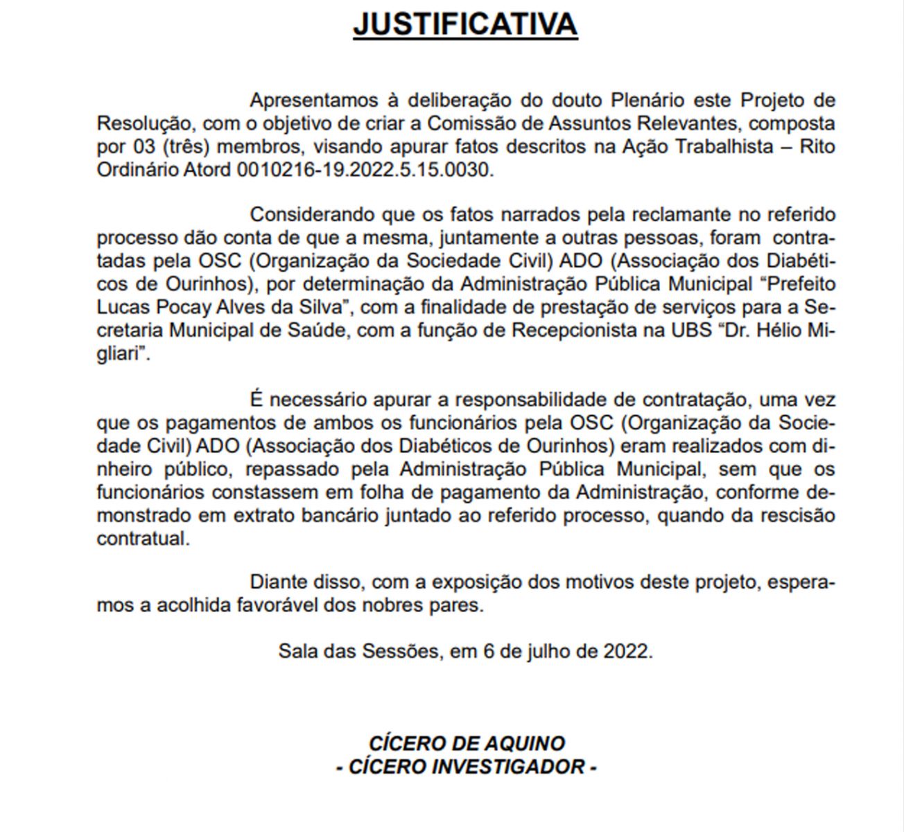 De acordo com a justificativa do vereador, tudo começou através de uma Ação Trabalhista – Rito Ordinário Atord 0010216-19.2022.5.15.0030, que aponta que uma mulher, juntamente a outras pessoas, foram contratadas pela OSC (Organização da Sociedade Civil) ADO (Associação dos Diabéticos de Ourinhos), por determinação da Administração Pública Municipal “Prefeito Lucas Pocay Alves da Silva”, com a finalidade de prestação de serviços para a Secretaria Municipal de Saúde, com a função de Recepcionista na UBS “Dr. Hélio Migliari”.