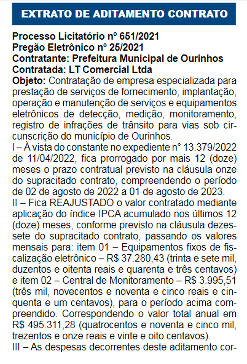 A Prefeitura de Ourinhos renovou o contrato com a empresa LT Comercial Ltda, de Araçoiaba da Serra (SP), que opera os 11 radares fixos instalados na cidade. Os serviços foram retomados em novembro de 2021, após ficarem mais de um ano sem operação. O valor do contrato foi reajustado em cerca de 10,2%. Antes o município pagava por mês R$37.499,99 e agora pagará R$41.275,94, o que equivale a R$495.311,28 por ano. Confira abaixo a publicação que está no Diário Oficial do Município desta sexta-feira, 19. Na sequencia relembre os locais onde os radares estão instalados:
