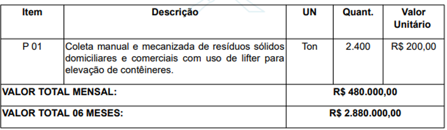 O contrato prevê o gasto de R$2.880.000,00 em seis meses. Será pago R$200,00 por tonelada de lixo, o equivalente a R$480 mil por mês.