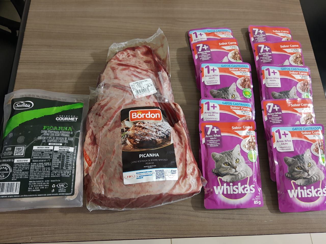 Durante a busca veicular, os policiais encontraram uma bolsa contendo diversos itens que foram subtraídos do supermercado. Os objetos recuperados foram identificados como produtos comercializados pelo estabelecimento.