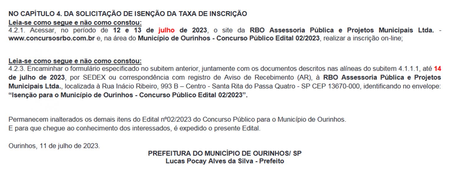 Outra retificação é com relação a solicitação de isenção da taxa de inscrição:
