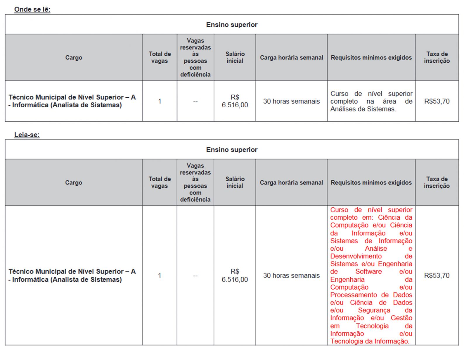 Nesta terça-feira, 11, no Diário Oficial do Município a Prefeitura de Ourinhos duas retificações. Uma nos Requisitos mínimos exigidos para o cargo de Técnico Municipal de Nível Superior – A - Informática (Analista de Sistemas), que agora exige urso de nível superior completo em: Ciência da Computação e/ou Ciência da Informação e/ou Sistemas de Informação e/ou Análise e Desenvolvimento de Sistemas e/ou Engenharia de Software e/ou Engenharia da Computação e/ou Processamento de Dados e/ou Ciência de Dados e/ou Segurança da Informação e/ou Gestão em Tecnologia da Informação e/ou Tecnologia da Informação.