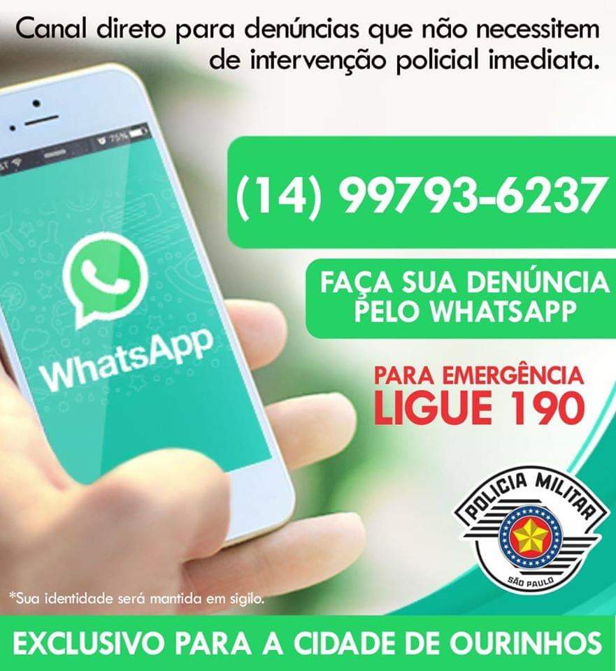 O número de whatsapp é exclusivo para Ourinhos e está disponível para receber denúncia de forma fácil e ágil, com a garantia de sigilo absoluto. Para emergências a população deve ligar para 190.