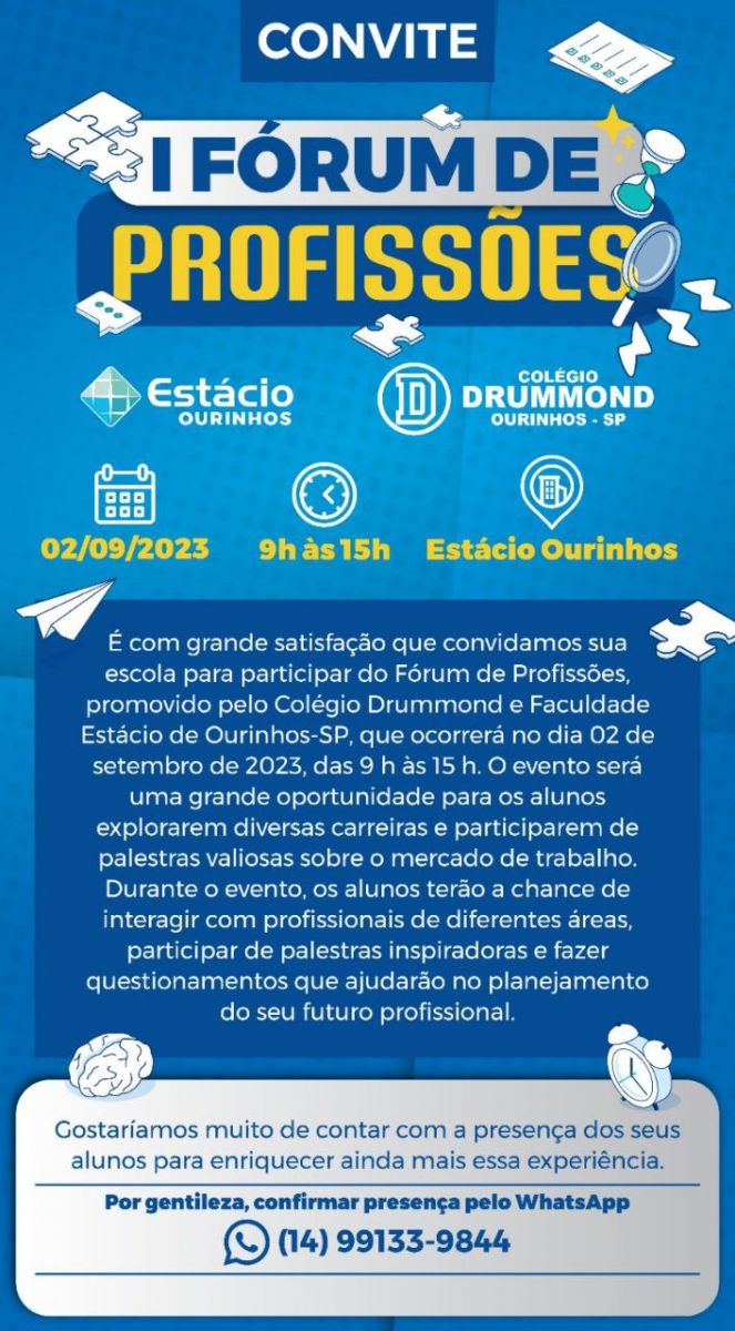 A Faculdade Estácio de Ourinhos e o Colégio Drummond se unem para apresentar uma oportunidade única aos jovens de Ourinhos e região em busca de esclarecimentos sobre suas futuras carreiras. O 1º Fórum de Profissões, marcado para o dia 2 de setembro de 2023, das 9h às 15h, no Campus Estácio Ourinhos, promete ser um marco na orientação profissional e no estímulo ao planejamento de carreira.