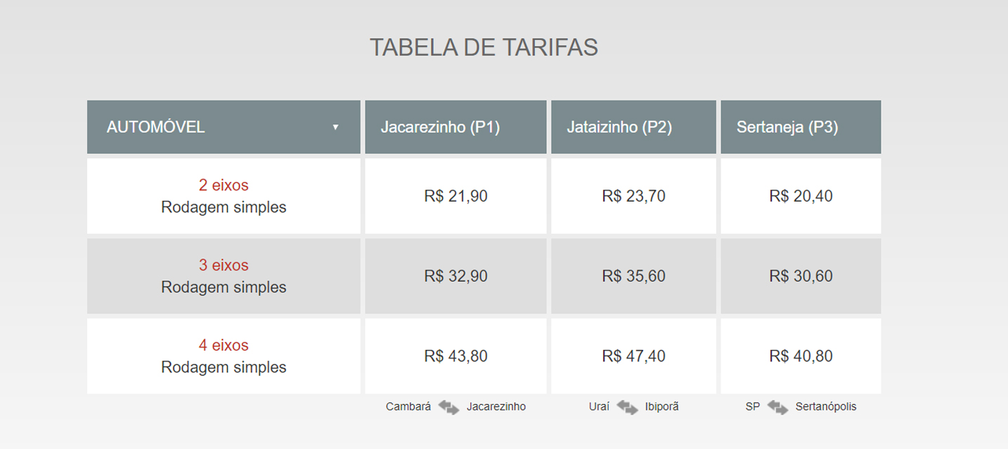 Hoje, as tarifas cobradas pela concessionária estão fixadas em R$ 21,90 na praça de Jacarezinho, R$ 23,70 na de Jataizinho e R$ 20,40 na de Sertaneja para automóveis.