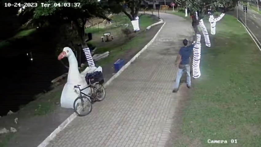 De acordo com imagens da central de videomonitoramento da Prefeitura, o suspeito foi flagrado destruindo as luzes de uma árvore e tentando arrancar fios de um cisne de concreto que faz parte da decoração às margens do lago, conhecido como Lago do Royal Park.