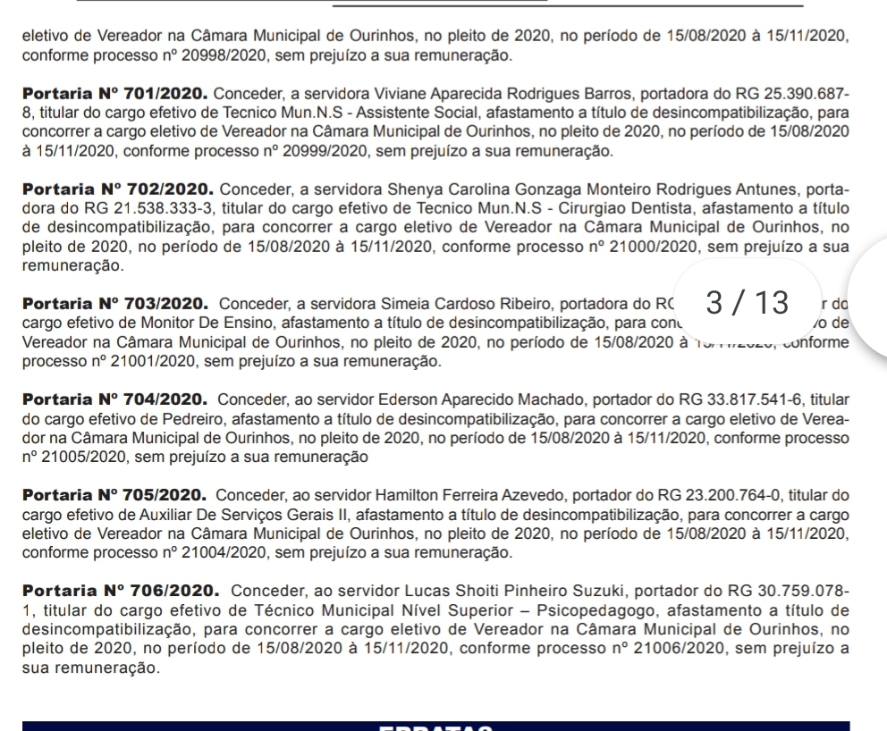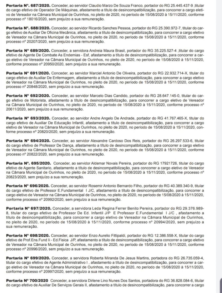 As eleições municipais deste ano acontecerão no dia 15 de novembro. Os eleitores escolherão o novo prefeito e o vice, além de novos vereadores. Os agentes públicos tinham até este sábado, 15, para realizar a desincompatibilização para disputar as eleições deste ano e diante disso, nesta última sexta-feira, 14, a SAE (Superintendência de Água e Esgoto) publicou no Diário Oficial do Município uma série de concessões de licenças para atividade política e nesta terça-feira, 18, foi a vez da Prefeitura publicar e 19 servidores efetivos deverão concorrer ao cargo de vereador da cidade. Confira abaixo a relação publicada: