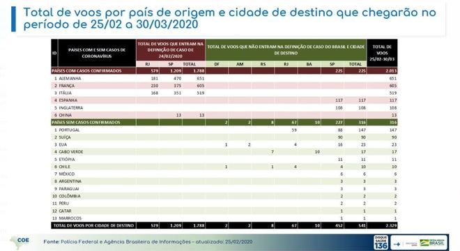 A Polícia Federal e a ABIN (Agência Brasileira de Inteligência) monitoram todos os voos que chegarão ao Brasil entre esta terça-feira (25) e o dia 30 de março. Uma tabela de acompanhamento, obtida com exclusividade pela Record TV, foi montada e pelo levantamento 2.013 voos de países com casos confirmados até agora irão pousar em aeroportos brasileiros.