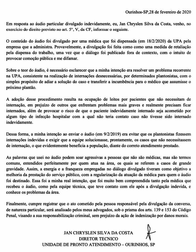 A administração da UPA confirmou, em nota, que o áudio foi enviado via WhatsApp pelo Jan para Valeska que fazia parte do corpo clínico da unidade emergencial de saúde e foi demitida no último dia 18 de fevereiro.