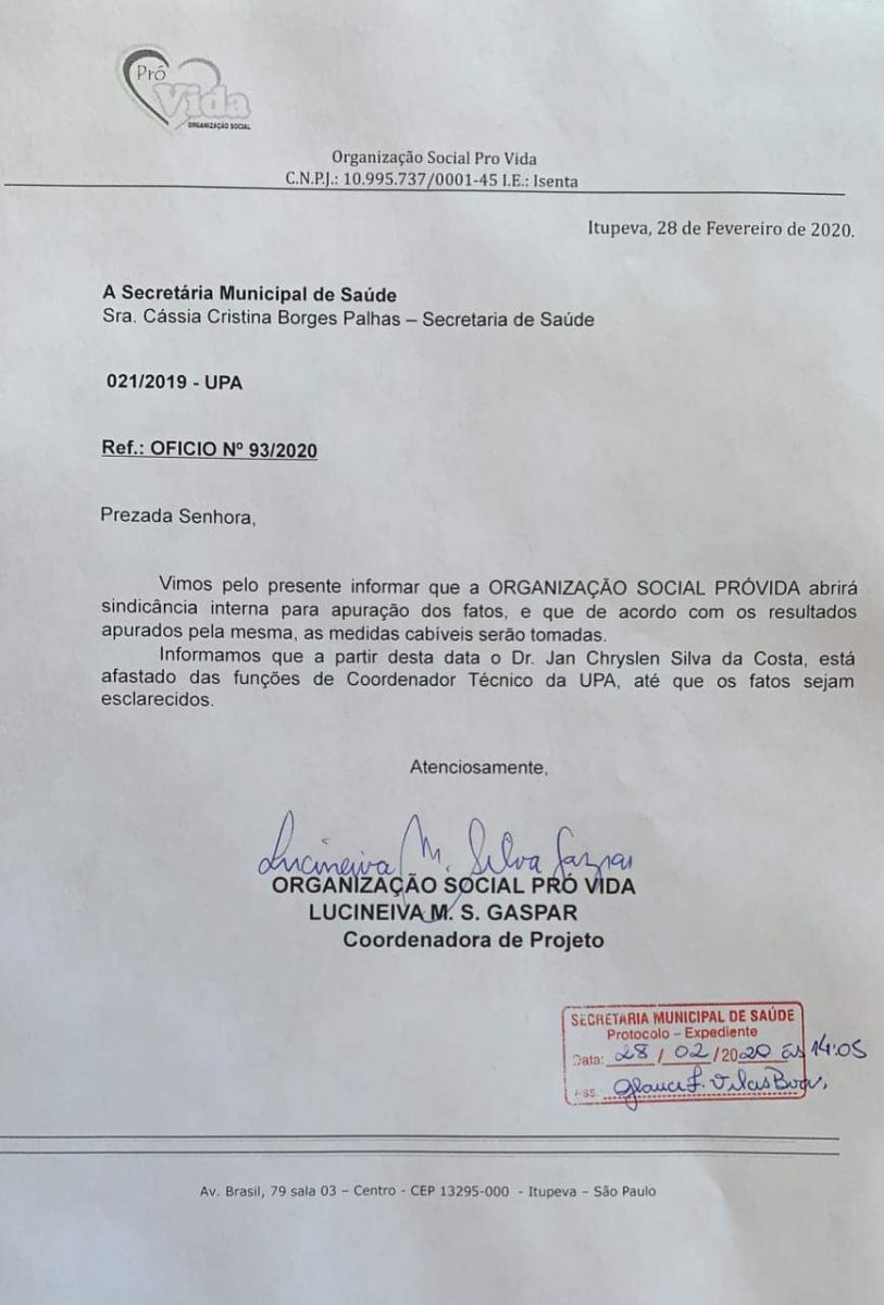 Diante das constatações, a Organização Social Pró-Vida, que administra a UPA 24h, abriu um processo administrativo para apurar as circunstâncias do fato e uma reunião foi realizada nesta sexta-feira (28) para definir as atitudes que serão tomadas. O diretor foi afastado das funções até o esclarecimento dos fatos.