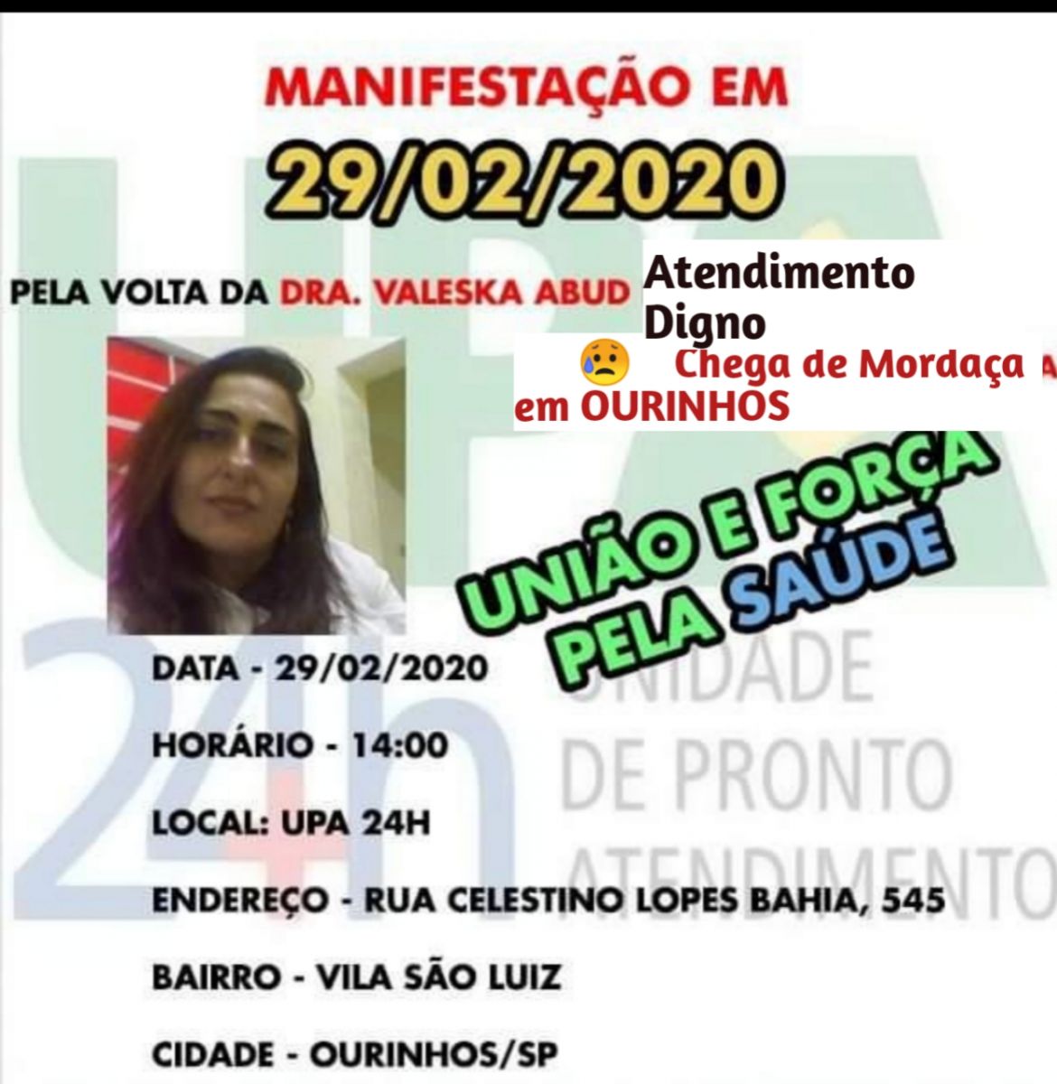Está marcada para daqui a pouco às 14h, em frente a UPA de Ourinhos, uma manifestação pacífica de pessoas simpatizantes a médica Valeska Abud. O Passando a Régua vai acompanhar.