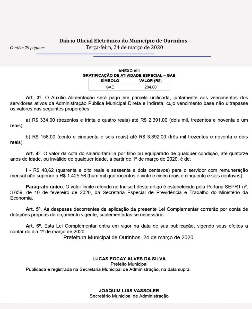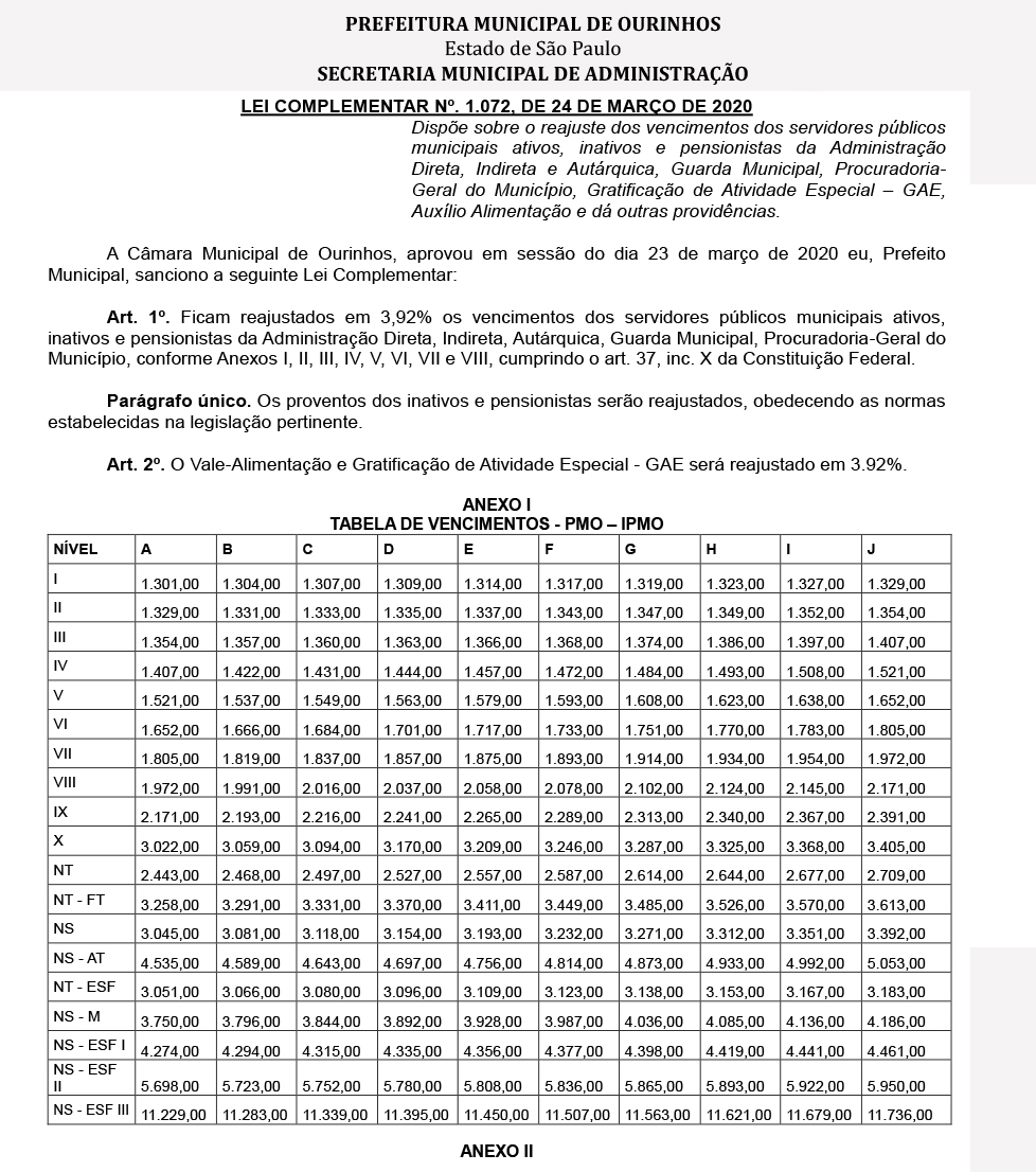 O prefeito de Ourinhos, Lucas Pocay, publicou nesta terça-feira, 24, no Diário Oficial do Município, a LEI COMPLEMENTAR Nº. 1.072, DE 24 DE MARÇO DE 2020, que dispõe sobre o reajuste dos vencimentos dos servidores públicos municipais ativos, inativos e pensionistas da Administração Direta, Indireta e Autárquica, Guarda Municipal, Procuradoria Geral do Município, Gratificação de Atividade Especial – GAE, Auxílio Alimentação e dá outras providências.