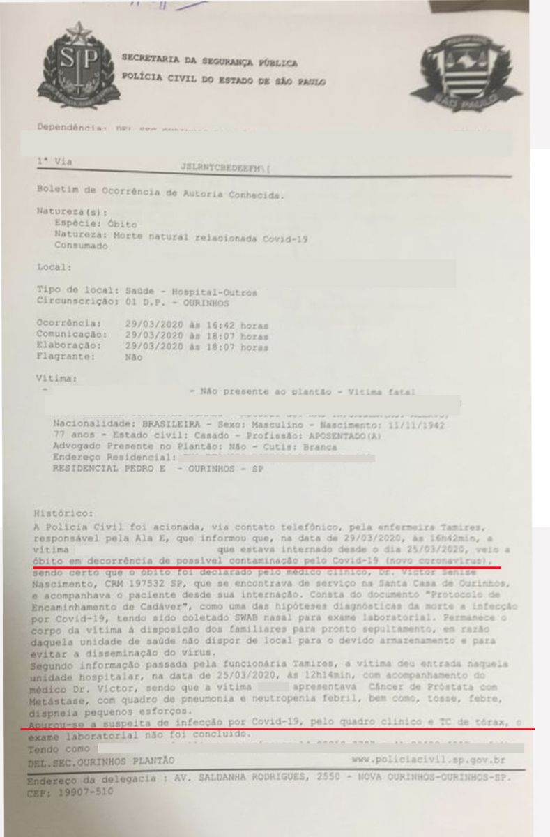 Segue abaixo o Boletim de Ocorrência registrado no 1º Distrito Policial de Ourinhos, na tarde deste domingo, onde o médico clínico aponta a suspeita da COVID-19, do paciente de 77 anos, que deu entrada na Santa Casa de Ourinhos, na última quarta-feira, dia 25, com quadro de pneumonia e neutropenia febril, bem como tosse e febre. O caso ficará sob investigação.