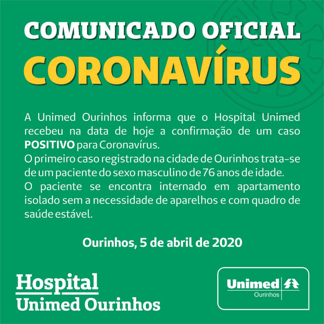 A Prefeitura de Ourinhos confirmou, na tarde deste domingo, 5, o 1º caso da COVID-19, transmitido pelo novo coronavírus. Trata-se de um idoso de 76 anos, que está internado no hospital particular da Unimed de Ourinhos.