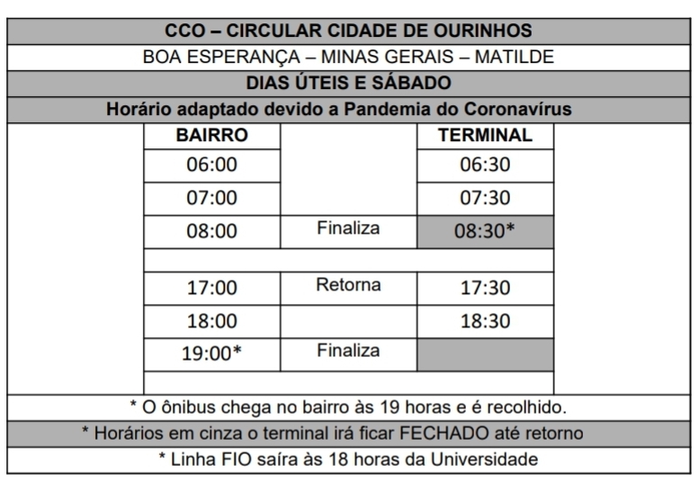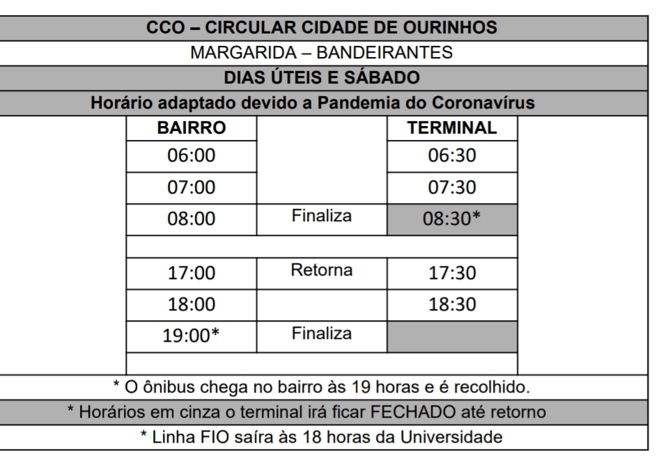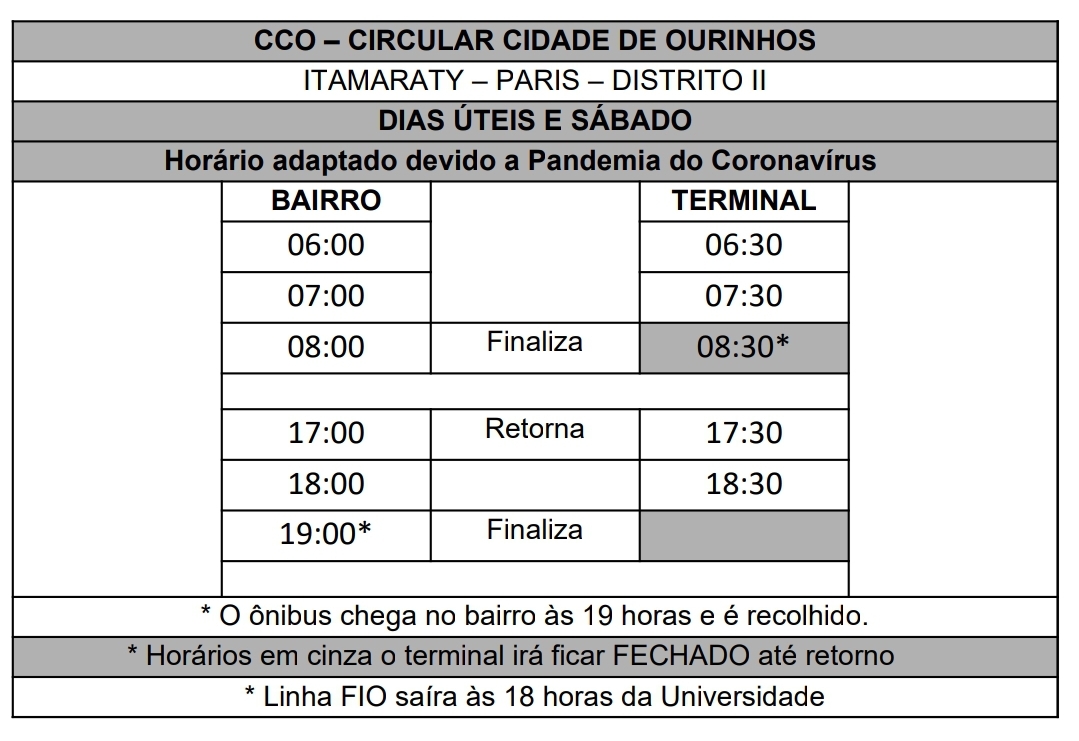 A empresa Circular Cidade de Ourinhos (CCO) anunciou na manhã desta quinta-feira, 9, alterações nos horários de linhas urbanas e a empresa AVOA (Aviação Ourinhos Assis), do mesmo grupo, destacou a operação em dois horários da linha suburbana, para atender especialmente os profissionais de saúde da região, que atuam em Ourinhos.
