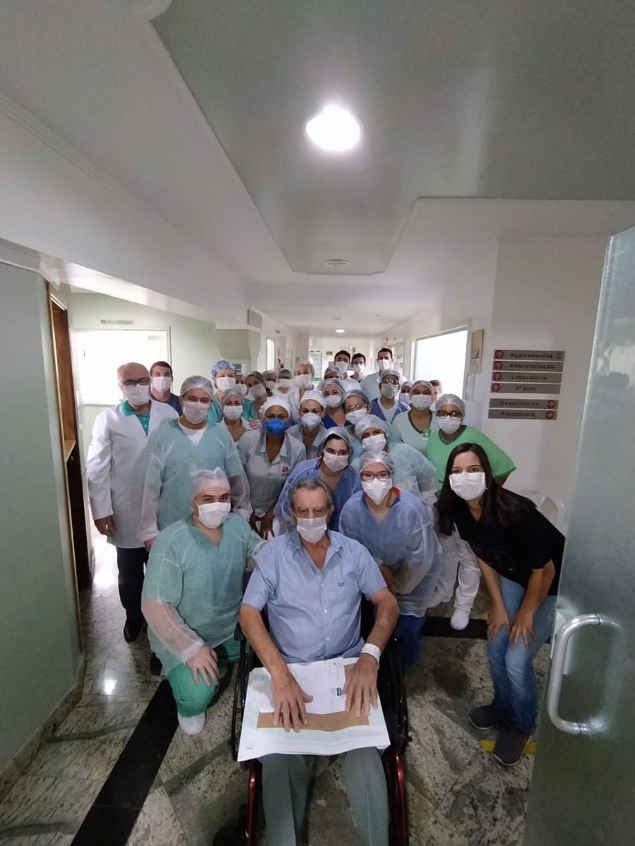 I.G. de 76 anos de idade saiu sob aplausos da equipe médica, enfermeiros e dos colaboradores nos corredores do hospital, levado em cadeira de rodas e visivelmente emocionado com a recuperação.