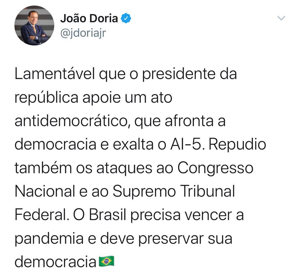 O Governador João Doria rebateu os protestos em sua conta no Twiter e disse ser lamentável e uma afronta a democracia. Confira abaixo: