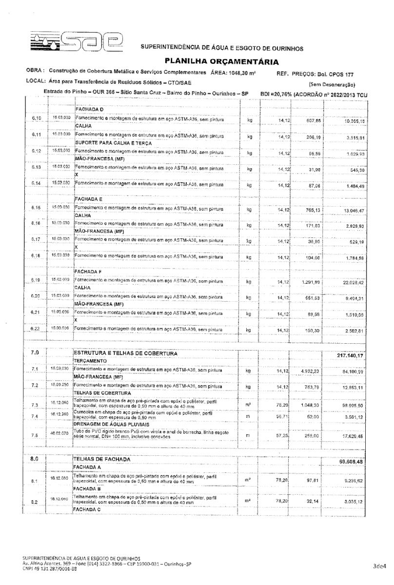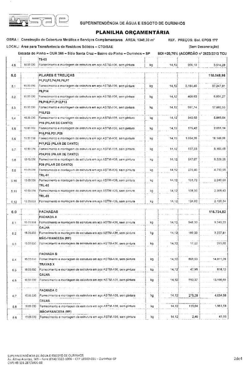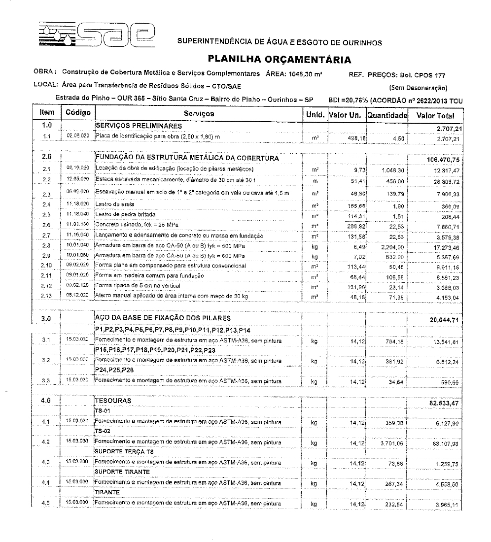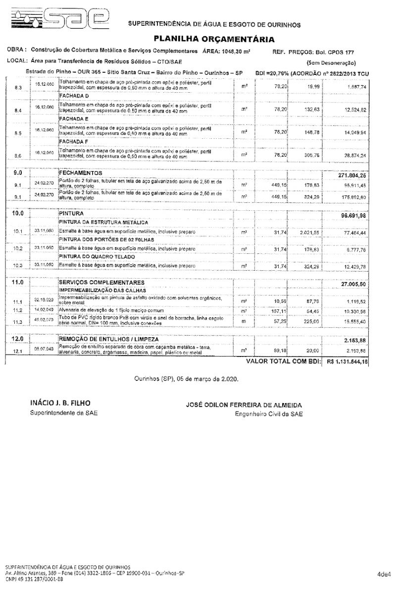 O que chama a atenção é que essa implantação vai mais que triplicar o valor inicial da obra, que custou R$462.014,55, passando a custar com o incremento da cobertura R$1.612.014,55.