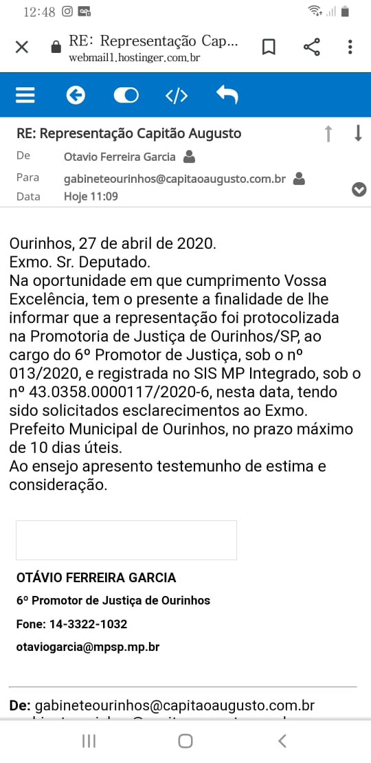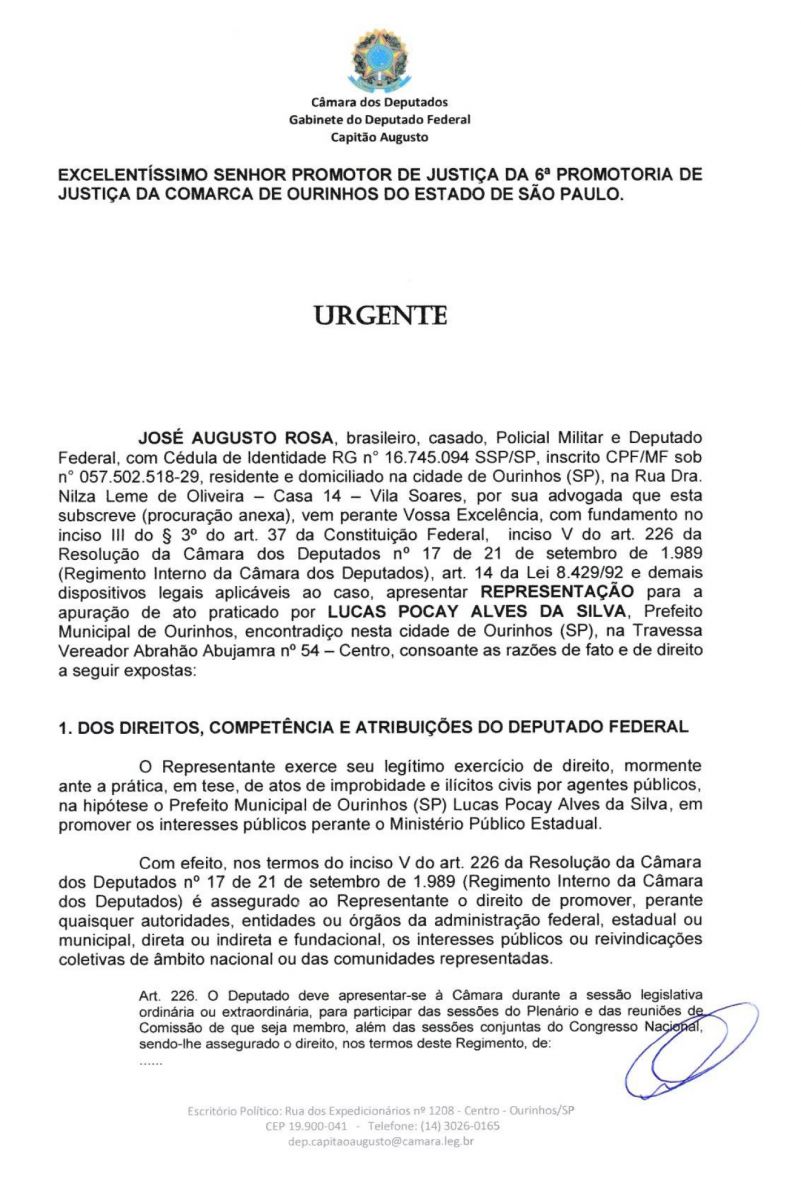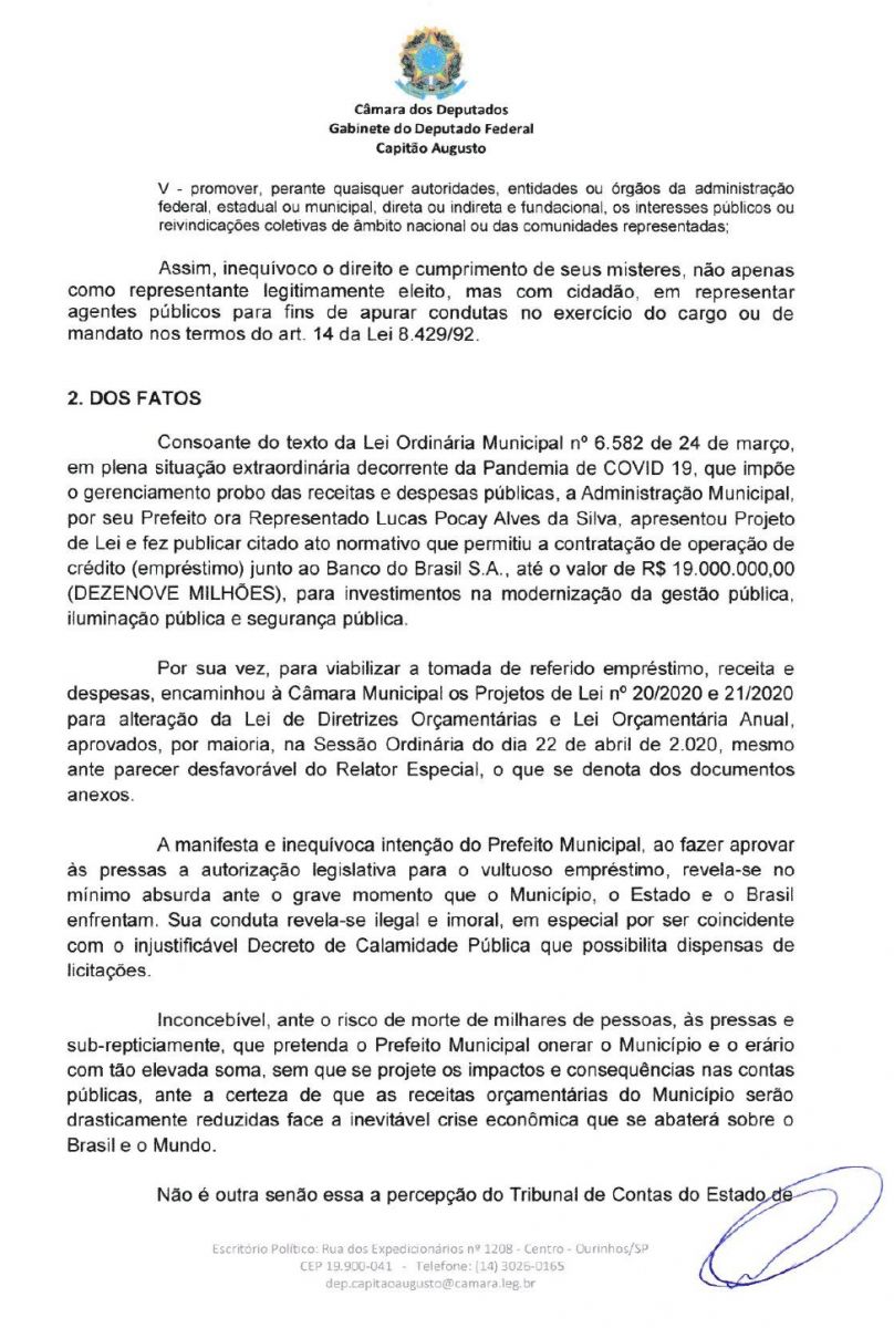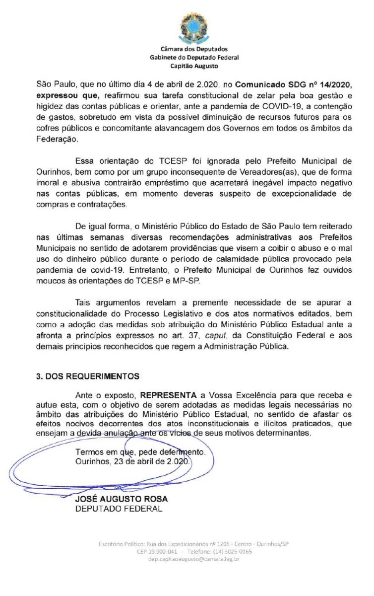 O deputado federal por Ourinhos, Capitão Augusto (PL) informou na tarde desta segunda-feira, 27, através de suas redes sociais que solicitou ao Ministério Público (MP) o cancelamento do ato que o prefeito solicita o empréstimo de R$19 milhões ao Banco do Brasil. Tal ato foi publicado no Diário Oficial do Município do dia 24 de março. O empréstimo foi autorizado pela Câmara Municipal e segundo a Prefeitura de Ourinhos, os valores serão destinados a Investimentos na Modernização da Gestão Pública, Iluminação Pública e Segurança Pública.