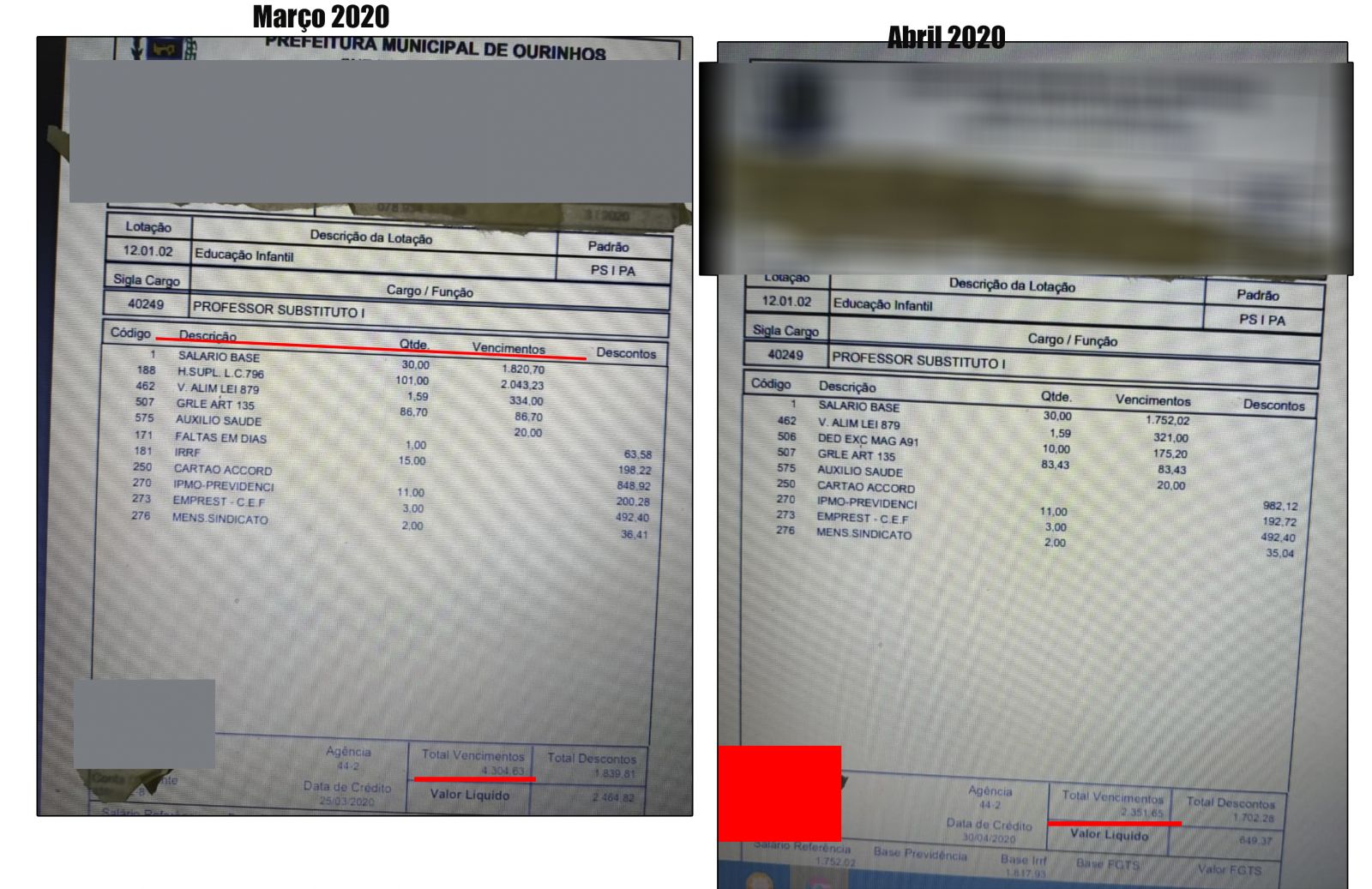 Confira abaixo os holerites dos meses de março e abril de uma professora substituta: