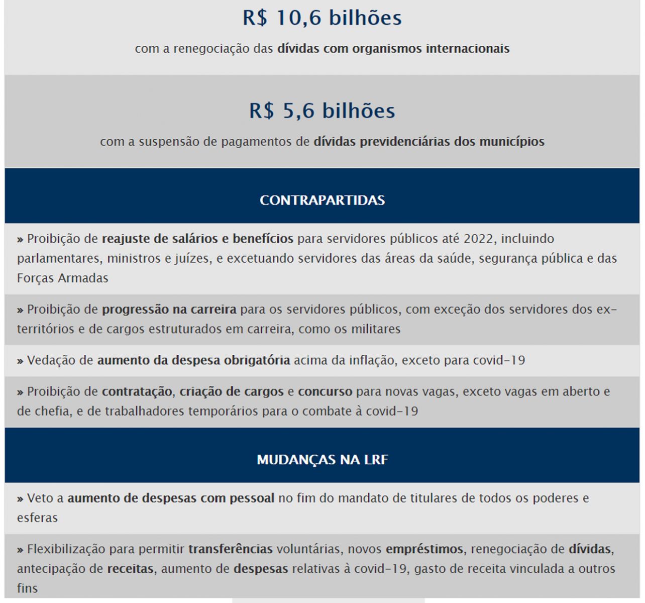Além dos repasses, os estados e municípios serão beneficiados com a liberação de R$ 49 bilhões através da suspensão e renegociação de dívidas com a União e com bancos públicos e de outros R$ 10,6 bilhões pela renegociação de empréstimos com organismos internacionais, que têm aval da União. Os municípios serão beneficiados, ainda, com a suspensão do pagamento de dívidas previdenciárias que venceriam até o final do ano. Essa medida foi acrescentada ao texto durante a votação, por meio de emenda, e deverá representar um alívio de R$ 5,6 bilhões nas contas das prefeituras. Municípios que tenham regimes próprios de previdência para os seus servidores ficarão dispensados de pagar a contribuição patronal, desde que isso seja autorizado por lei municipal específica.
