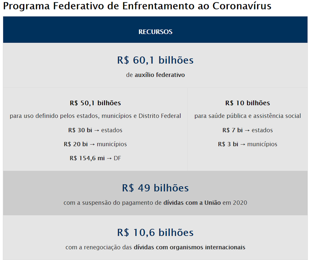 - R$ 60 bilhões de repasses da União a estados e municípios para financiar ações de enfrentamento ao coronavírus;