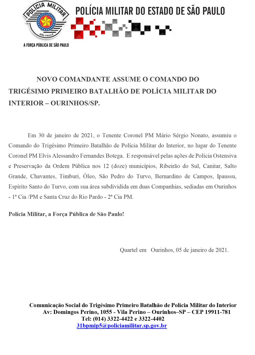 Desde o dia 30 de janeiro de 2021 Ourinhos e região tem um novo comandante do 31º Batalhão de Polícia Militar do Interior. O Tenente Coronel PM Mário Sérgio Nonato assumiu o posto, antes ocupado pelo Tenente Coronel PM Elvis Alessandro Fernandes Botega. Nesta terça-feira, 9, o setor de comunicação do batalhão enviou à imprensa uma nota comunicando a nomeação. Confira abaixo: