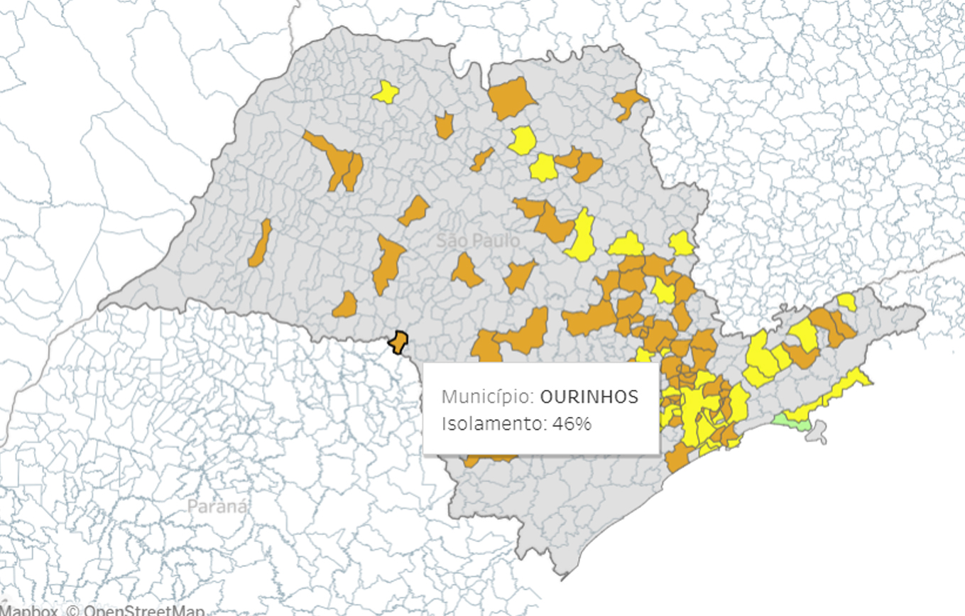 O governo de São Paulo divulgou na tarde de hoje (26), o percentual de Isolamento Social em Ourinhos, que foi de 50% no domingo, 24, mas caiu para 46% nesta segunda-feira, 25, mesmo com o feriado de 9 de julho antecipado.