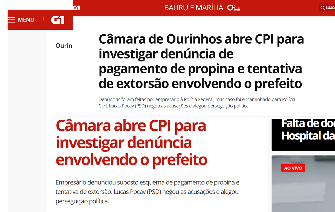 O site G1, que pertence ao grupo Globo e tem abrangência mundial, repercutiu na manhã desta quarta-feira, 27, a notícia da denúncia de suposto pagamento e tentativa de extorsão envolvendo o prefeito de Ourinhos Lucas Pocay (PSD), secretário, ex-secretários da atual administração e até o pai do prefeito, o ex-prefeito e ex-deputado, Claury Alves da Silva.