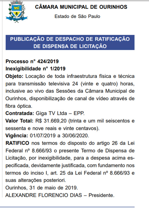 Foi publicado no Diário Oficial do Município de Ourinhos, na última terça-feira, 5, o despacho de “Ratificação de Dispensa de Licitação”, do Processo nº 424/2019, Inexigibilidade nº 1/2019, para contratar a empresa Giga TV Ltda – EPP, para locação de equipamentos para TV Câmara de Ourinhos, ao valor de R$ 31.669,20.