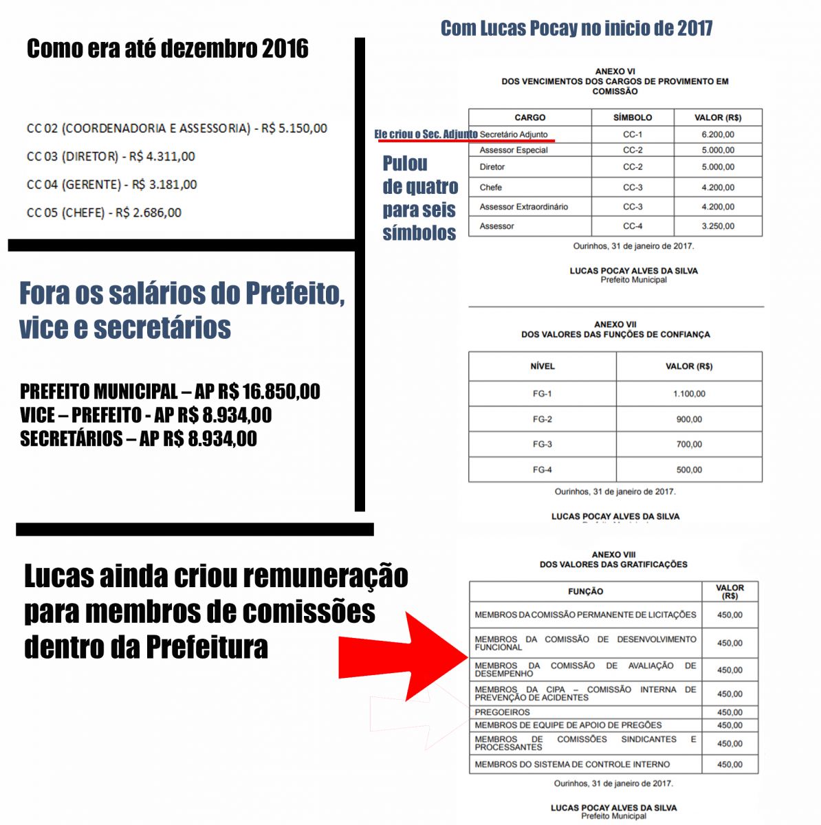 Em comparação aos seus antecessores na administração municipal, Lucas Pocay conseguiu aumentar as remunerações dos comissionados e criou cargos que não existiam, como de Secretário Adjunto, além das centenas de F.C.s (Funções de Confiança), que antigamente tinham o nome de F. G.s (Funções Gratificadas), que o prefeito praticamente dobrou os valores para favorecer aliados dentro da prefeitura e suas autarquias como SAE (Superintendência de Água e Esgoto de Ourinhos), que possui diversos comissionados e FCs. O prefeito também criou a remuneração para membros de Comissões em suas secretarias. Veja abaixo a ilustração: