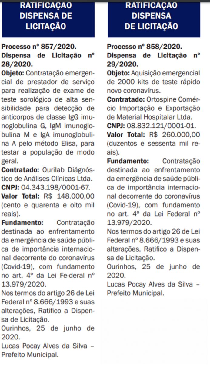 A Prefeitura de Ourinhos publicou no Diário Oficial do Município desta sexta-feira, 26, a compra emergencial, sem licitação, de 3 mil testes rápidos para Covd-19. De acordo com a publicação, os testes serão direcionados para população em geral e são divididos em dois tipos diferentes: