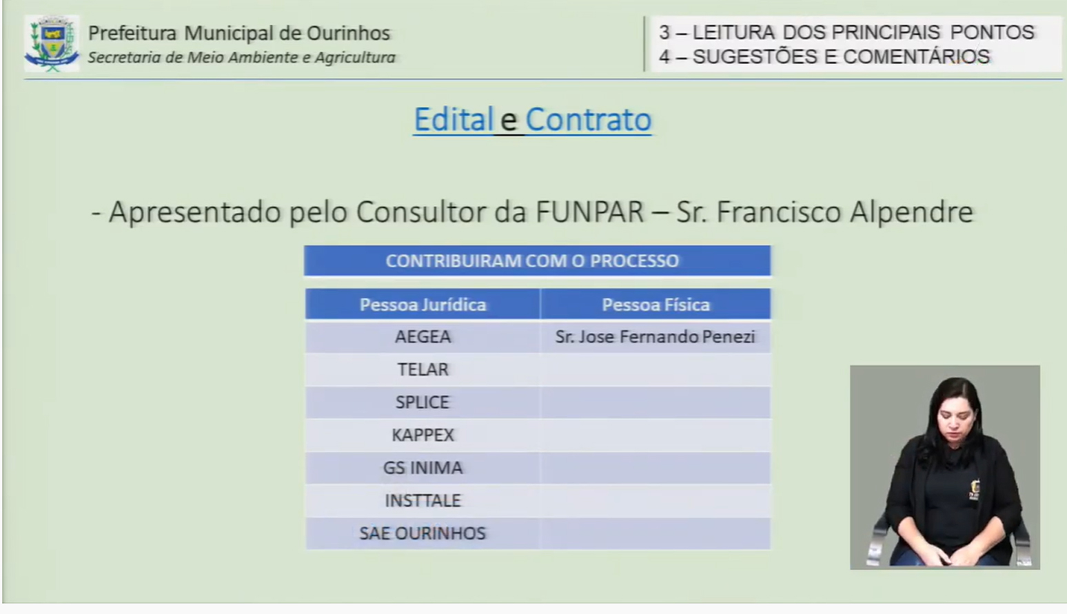 A audiência foi comandada pelo secretário de Meio Ambiente, Maurício Amorosini, que contou com a apresentação do consultor da FUNPAR (FUNDAÇÃO DA UNIVERSIDADE FEDERAL DO PARANÁ PARA O DESENVOLVIMENTO DA CIÊNCIA, TECNOLOGIA E DA CULTURA), Senhor Francisco Alpendre. A FUNPAR foi contratada pela prefeitura, sem licitação, pelo valor de R$ R$ 190.850,00 (cento e noventa mil e oitocentos e cinquenta reais) para revisão das minutas de edital e contrato, bem como na elaboração de parecer a respeito de sua legalidade.