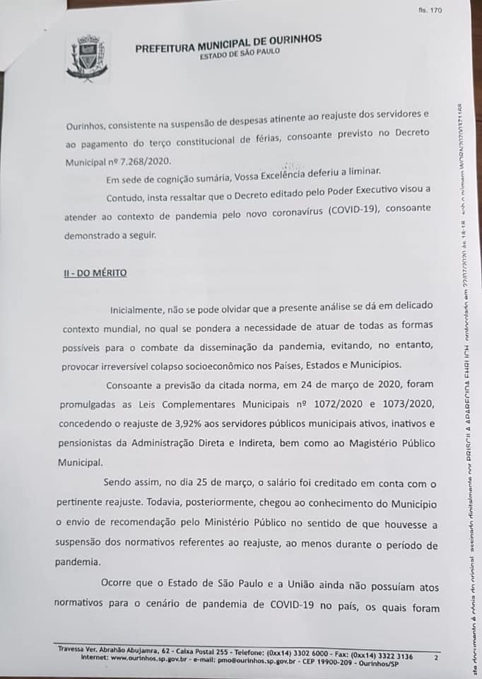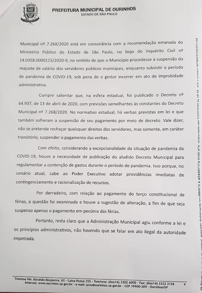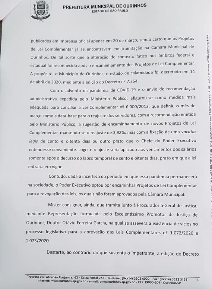 Vale lembrar que tal afirmação por parte do Prefeito deu-se somente após o Ministério Público recorrer da decisão que, liminarmente, determinou a suspensão do inciso I do artigo 3o do Decreto Municipal 7.268/20, bem como deu a interpretação do inciso III do mesmo artigo, garantindo aos servidores o direito ao recebimento do reajuste e recebimento de suas férias.