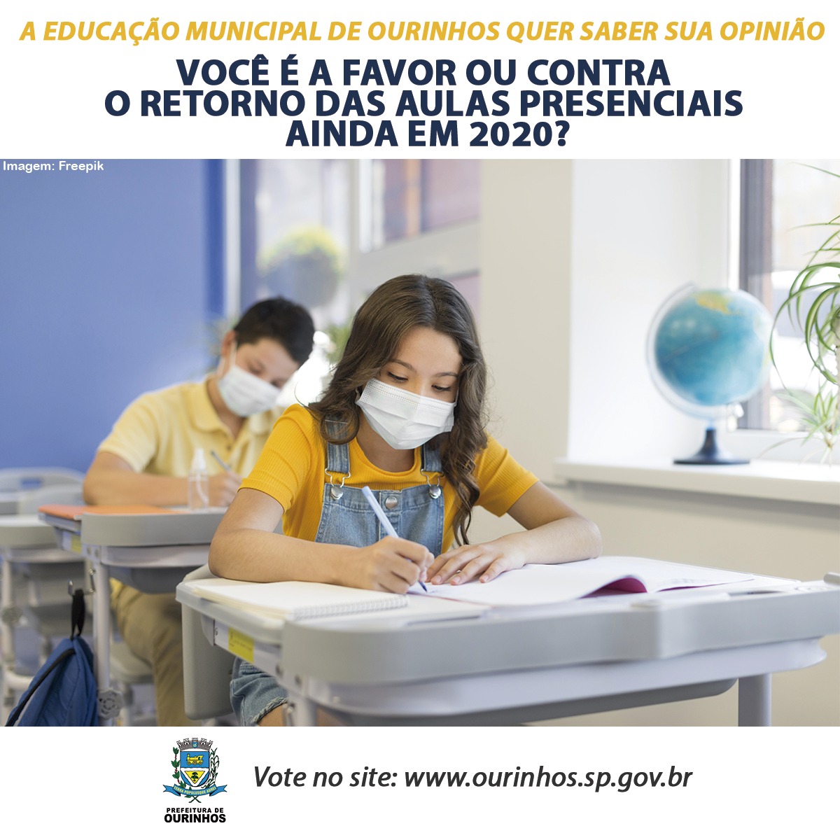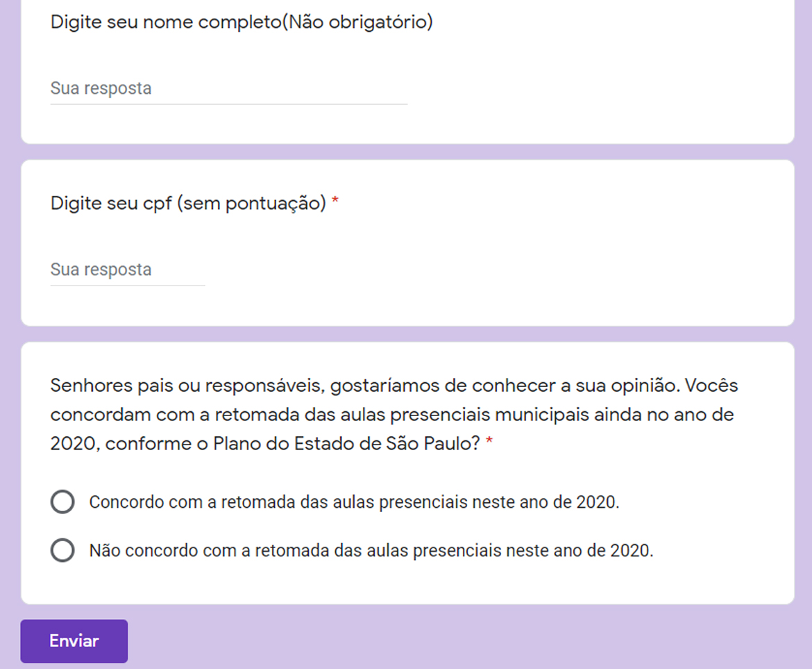 Circula nas redes sociais uma pesquisa on-line que quer saber a opinião, principalmente dos pais e responsáveis de alunos da Rede Municipal de Ensino de Ourinhos, se deveremos ter, ou não, o retorno de aulas presenciais ainda neste ano, de acordo com o Plano São Paulo, que prevê uma retomada em setembro. A pesquisa está sendo feita pela equipe gestora da Secretaria Municipal de Ourinhos. Confira abaixo o comunicado: