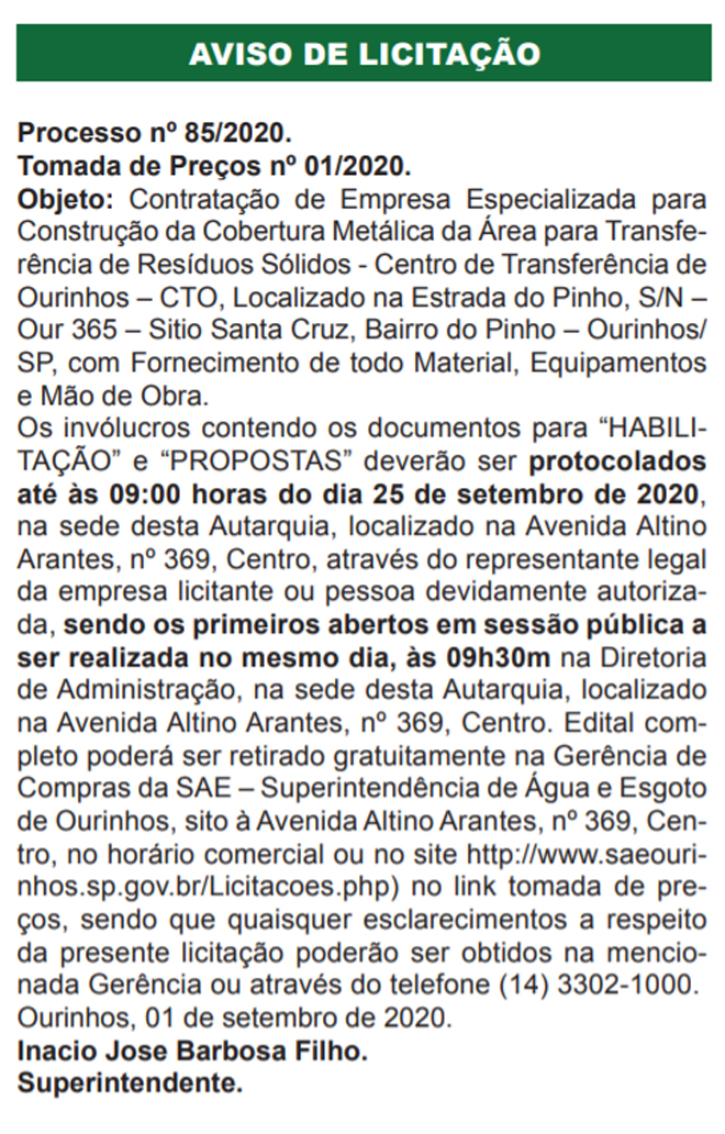 A SAE (Superintendência de Água e Esgoto de Ourinhos) publicou na edição do Diário Oficial do Município de Ourinhos, desta terça-feira, 1º, o aviso de licitação para contratar uma empresa para construir a cobertura do CTO – Centro de Transbordo de Resíduos Sólidos de Ourinhos, localizado na Água do Pinho, área rural do município. A contratação será feita no estilo ‘Tomada de Preços”