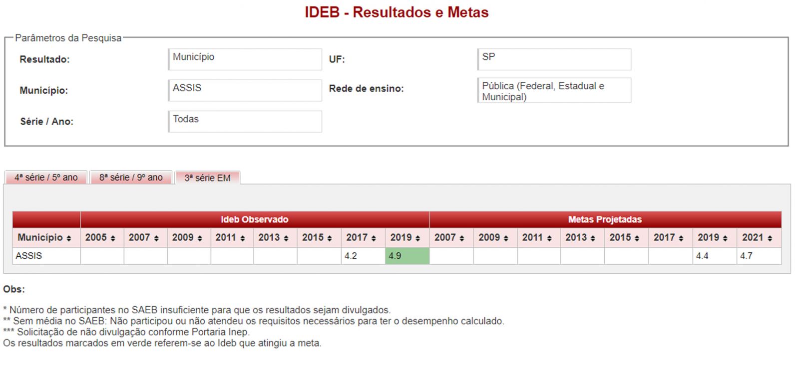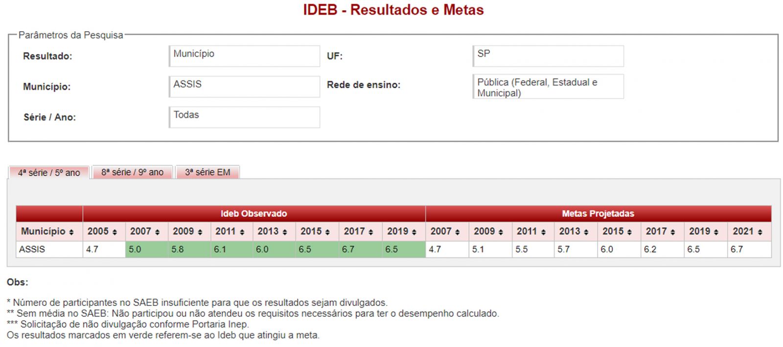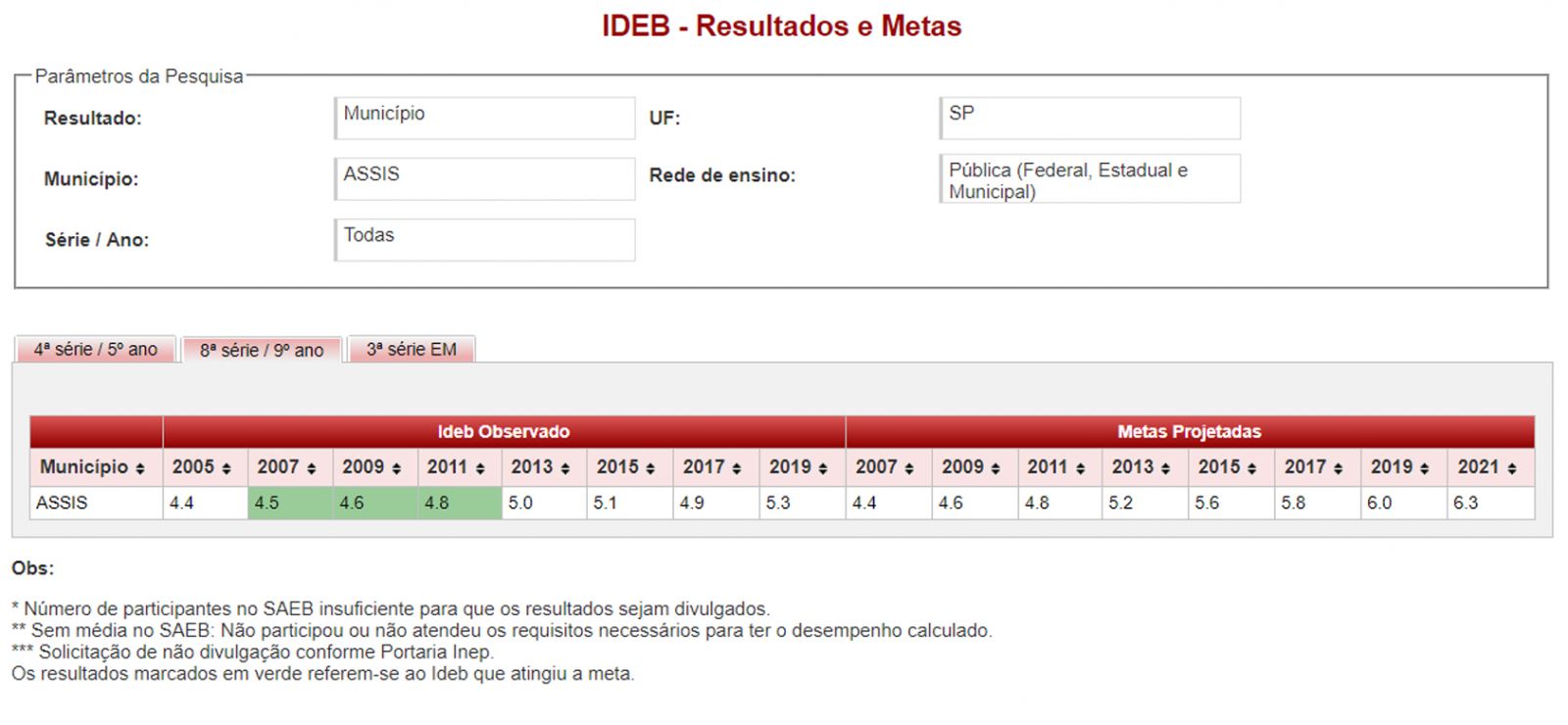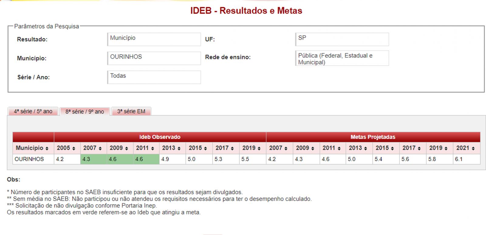 Confiram abaixo as tabelas apresentadas pelo site do Ideb: