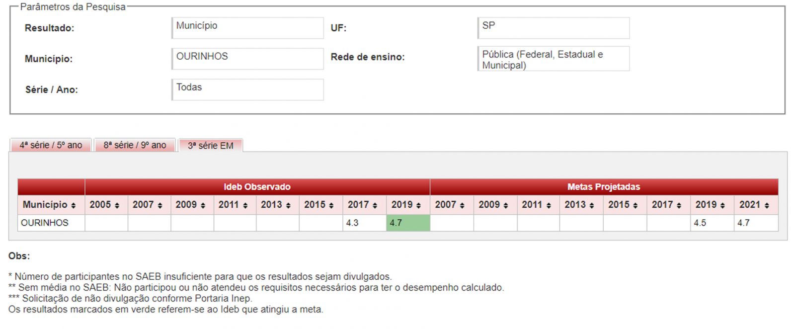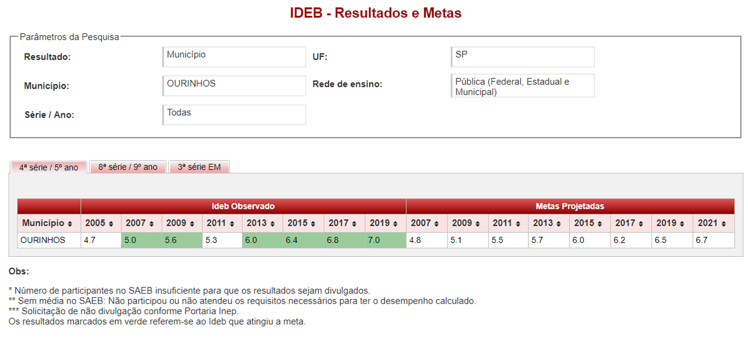 Alunos da 2ª fase do ensino fundamental das escolas públicas (entre municipais e estaduais) de Ourinhos não atingiram, em 2019, a meta do Ideb (Índice de Desenvolvimento da Educação Básica), fato que se repete desde 2013 com alunos da faixa escolar (8ª série/ 9º ano). O Ideb é o principal indicador de qualidade da educação brasileira. Os dados do Ideb foram divulgados hoje (15) pelo Instituto Nacional de Estudos e Pesquisas Educacionais Anísio Teixeira (Inep).