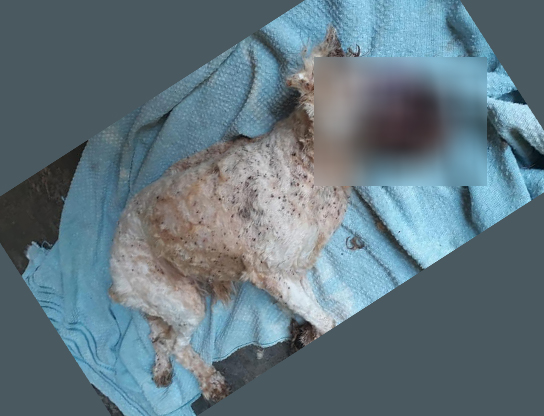 “O animal estava em decúbito lateral por não conseguir se manter em estação, com as mucosas pálidas, apatia, desidratação, petéquias, com infestação de pulgas e carrapatos, pelos extremamente embolados, sujos com fezes velhas e secas e molhado de urina. Na maior parte da face do animal (olhos, nariz) havia cavidade aberta, tomada por inúmeras larvas de insetos associada à muita secreção serosanguinolenta, extremamente fétida. pela ausência da parte da face, os olhos já estavam sem função (cegueira). o animal, ao ser consultado, vocalizava por dor, tinha sua pele inchada, inflamada e infeccionada na região facial. Apresentava salivação excessiva, respiração ofegante com a boca aberta. Na região genital também havia presença de fezes grudadas ao pelo. A aparência geral do animal era de um desleixo por meses, por descuido do proprietário. nas condições analisadas no momento da consulta e declaradas aqui, conferem que o animal sofre maus tratos há meses e que por muito tempo está nesta mesma condição degradante, sem cuidados básicos e mínimos para a manutenção da saúde. Foram prestados os primeiros atendimentos necessários ao animal e este está em observação para uma nova avaliação do caso e possibilidade de tratamento ou eutanásia”.