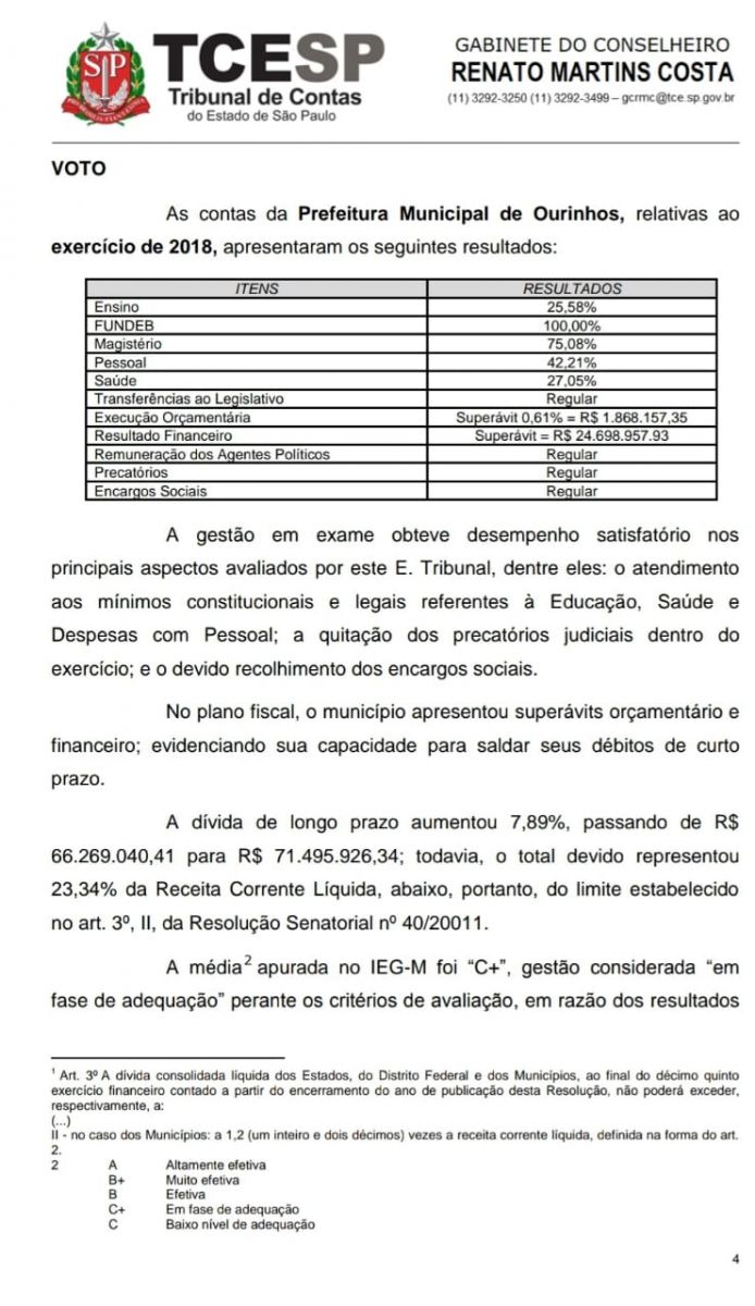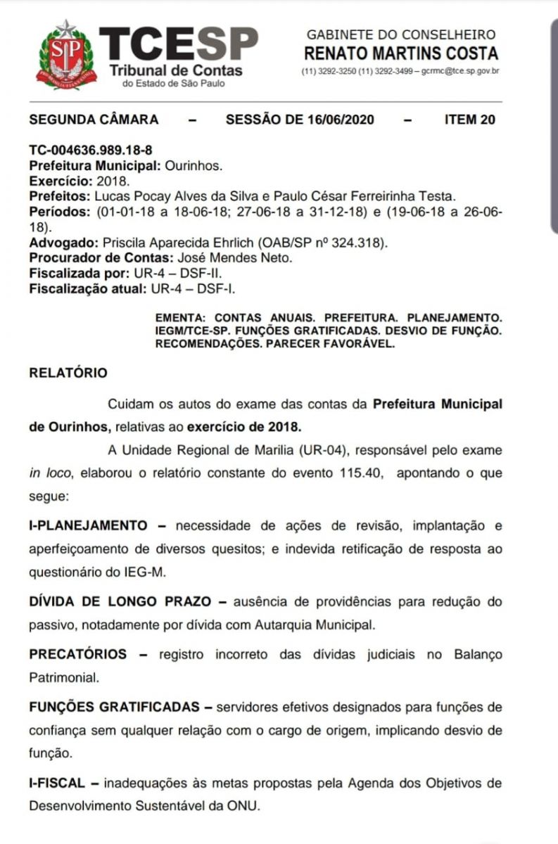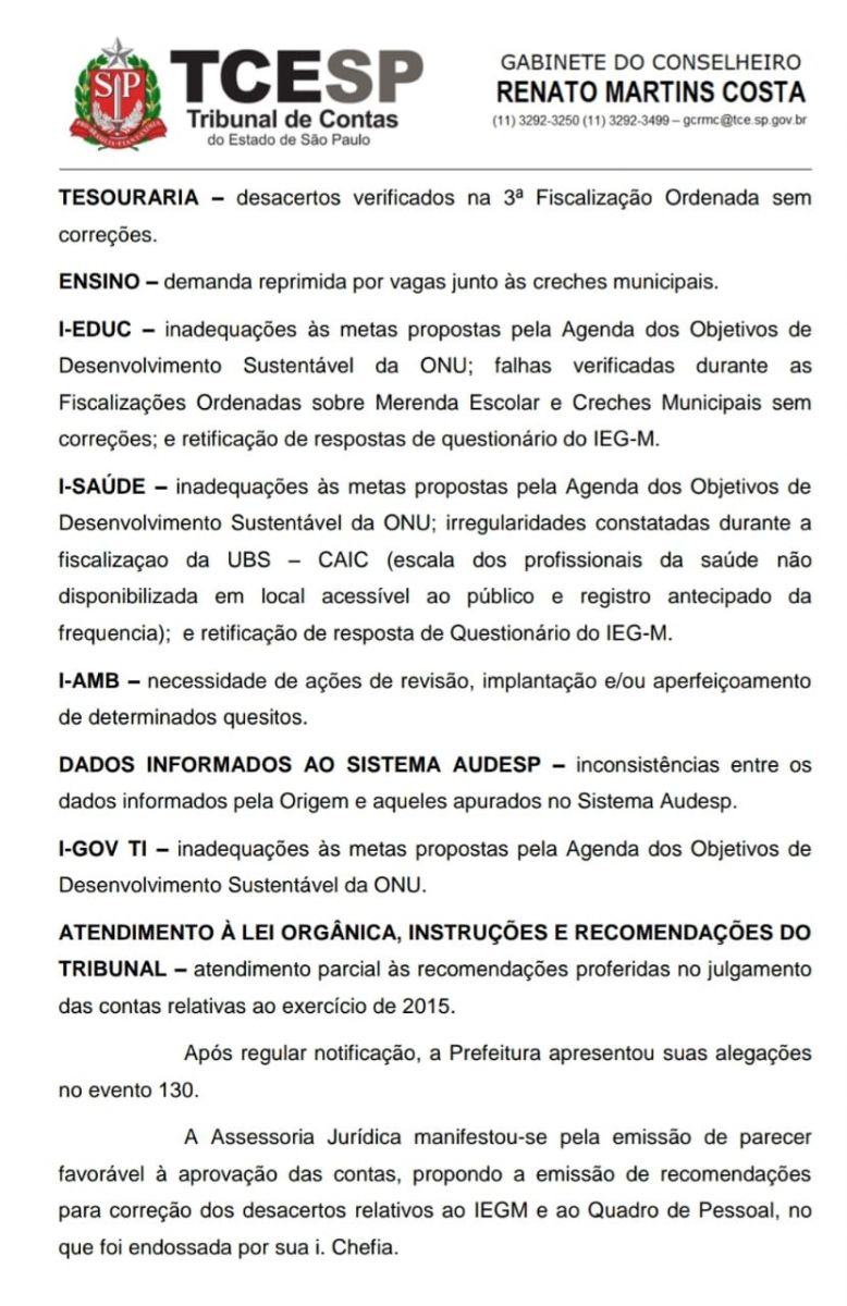 As contas do exercício 2018 do prefeito Lucas Pocay (PSD) e seu vice Ferreirinha (MDB) foram aprovadas pelo TC-SP, porém com índice do IEG-M C+ (Em fase de adequação) com diversas ressalvas de irregularidades. A média2 apurada no IEG-M foi “C+”, gestão considerada “em fase de adequação” perante os critérios de avaliação, em razão dos resultados insatisfatórios obtidos nos índices relativos aos setores de Planejamento, Saúde e Meio Ambiente.
